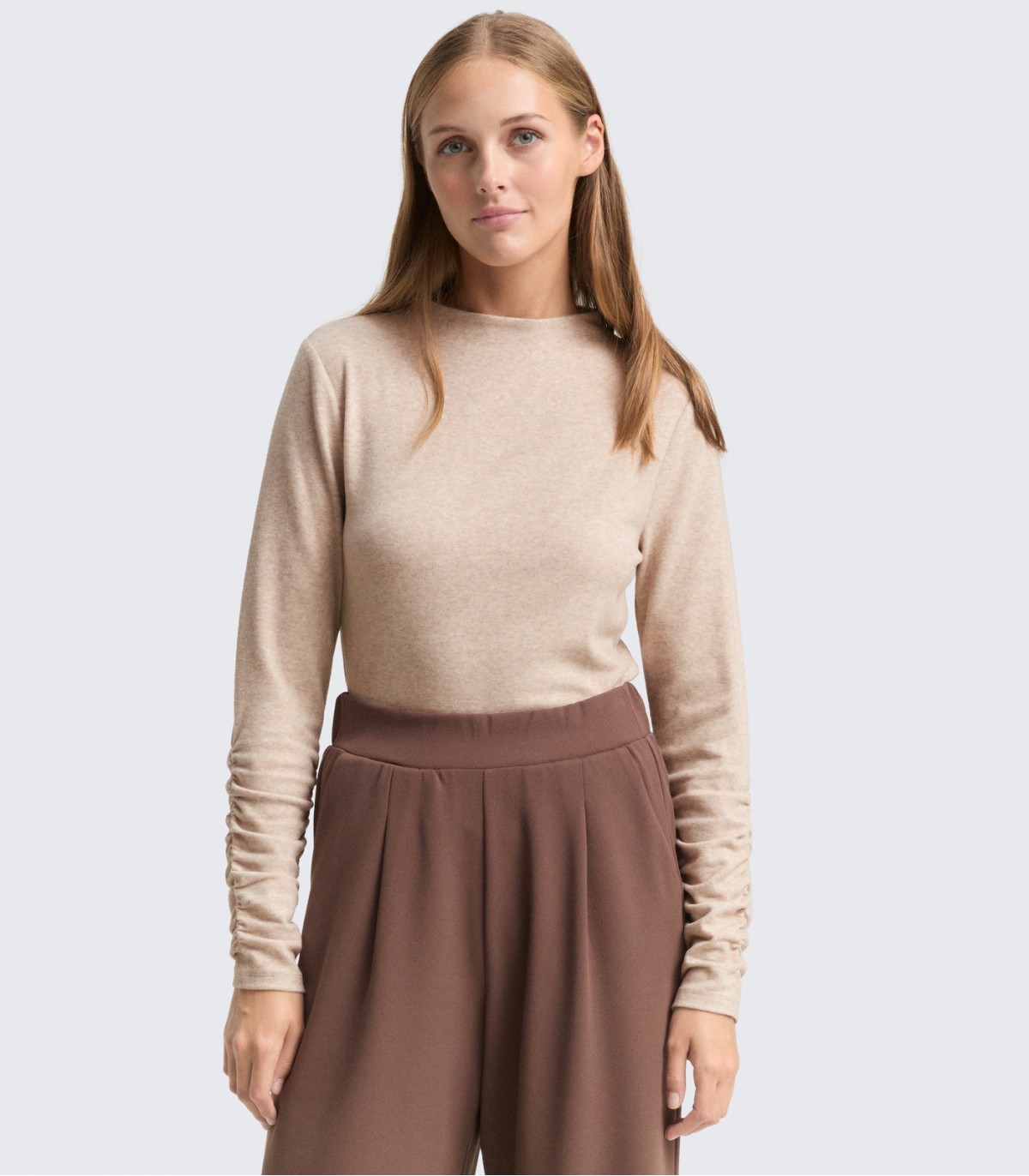 Женственная, удобная и мягкая рубашка с длинными рукавами и эффектными складками. Рубашка изготовлена из лёгкой и эластичной ткани и идеально подходит для повседневной носки или в качестве многослойного наряда в прохладную погоду.