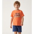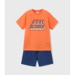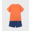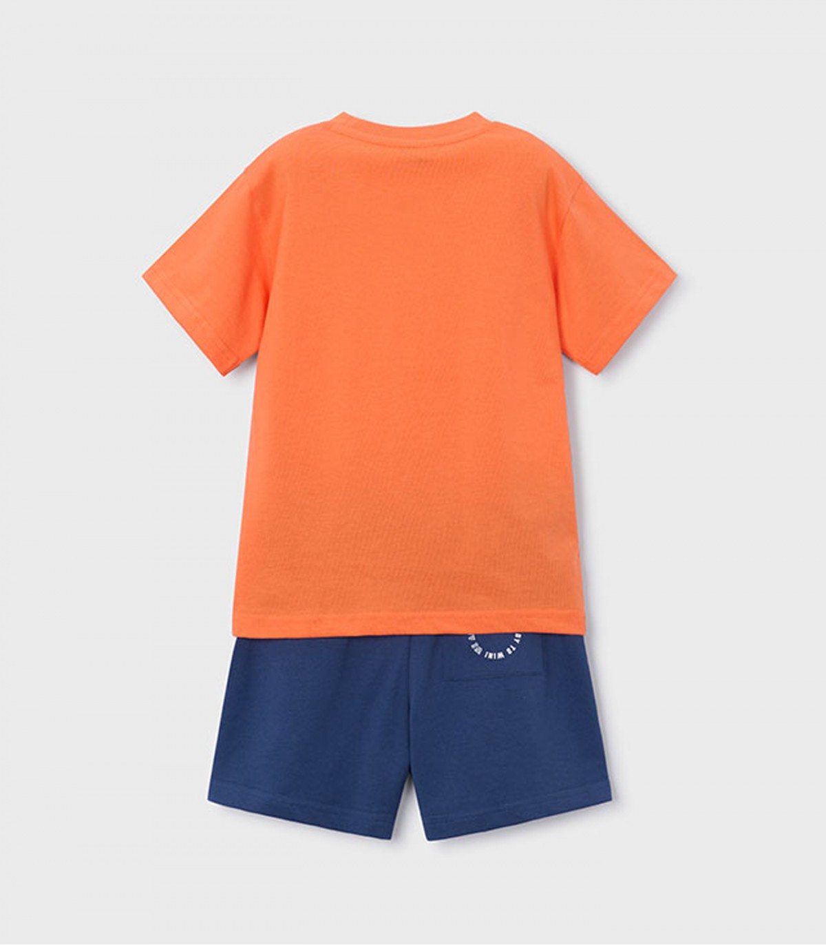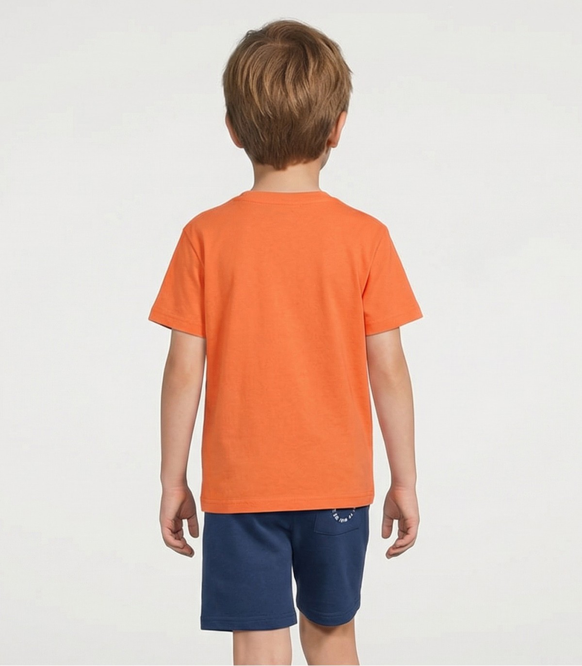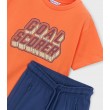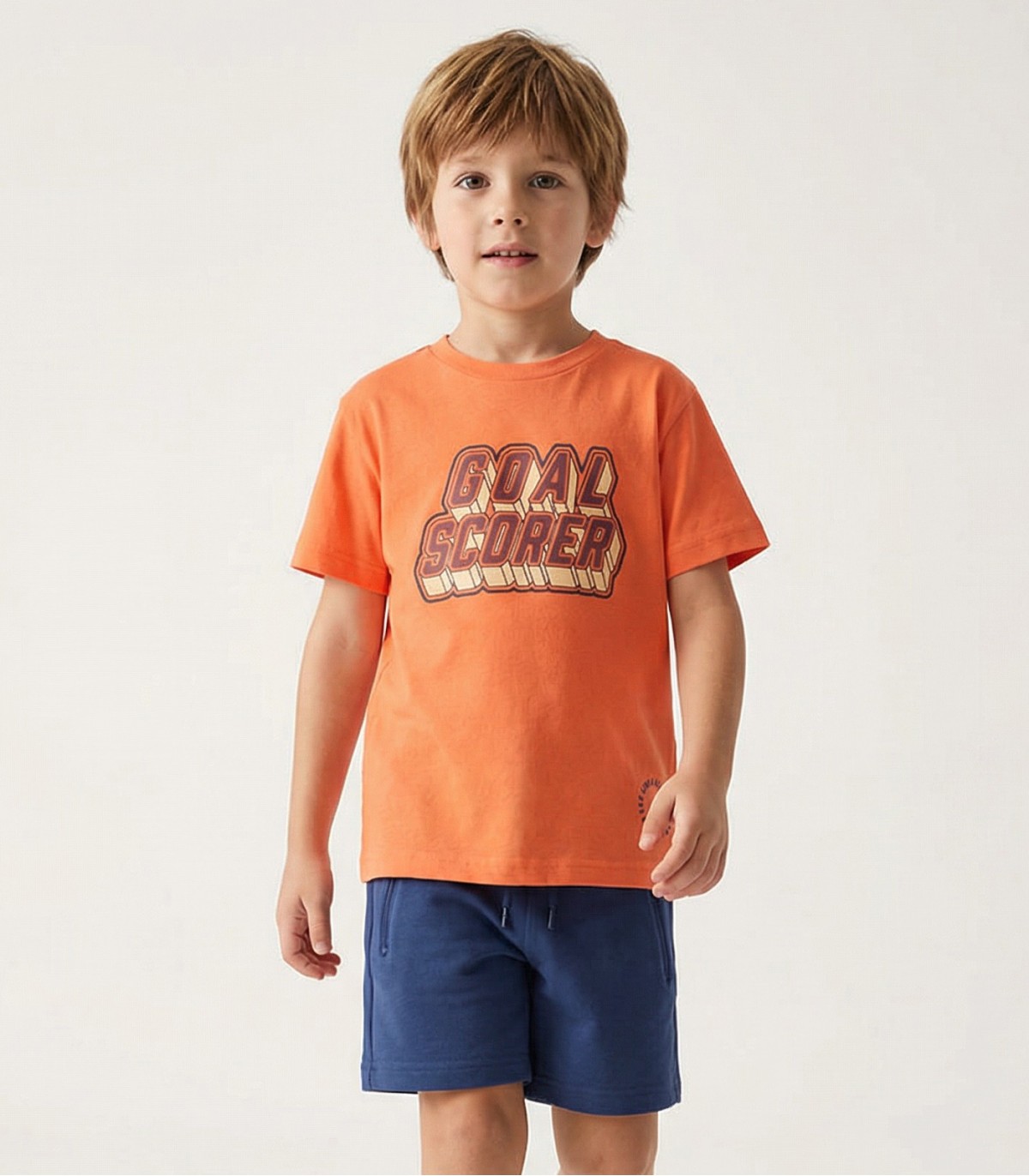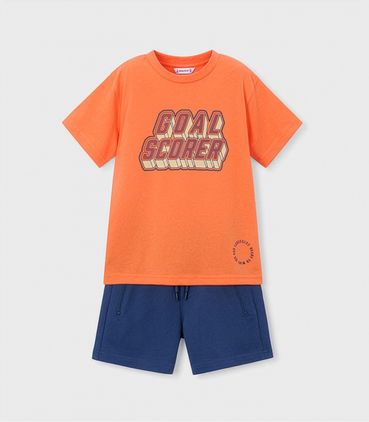 Удобный и спортивный комплект для мальчиков состоит из оранжевой футболки и темно-синих шорт. Футболка украшена принтом с надписью «GOAL SCORER», что придает образу энергию и игривость. Мягкий хлопковый материал дышащий и комфортный.