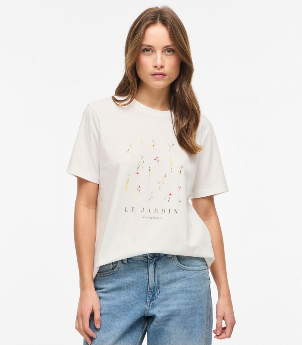 Мягкая женская футболка Vila удобна для повседневной носки. Нежный цветочный принт на груди добавляет декоративный элемент к простому дизайну. Легко сочетается с джинсами и юбками.