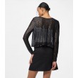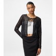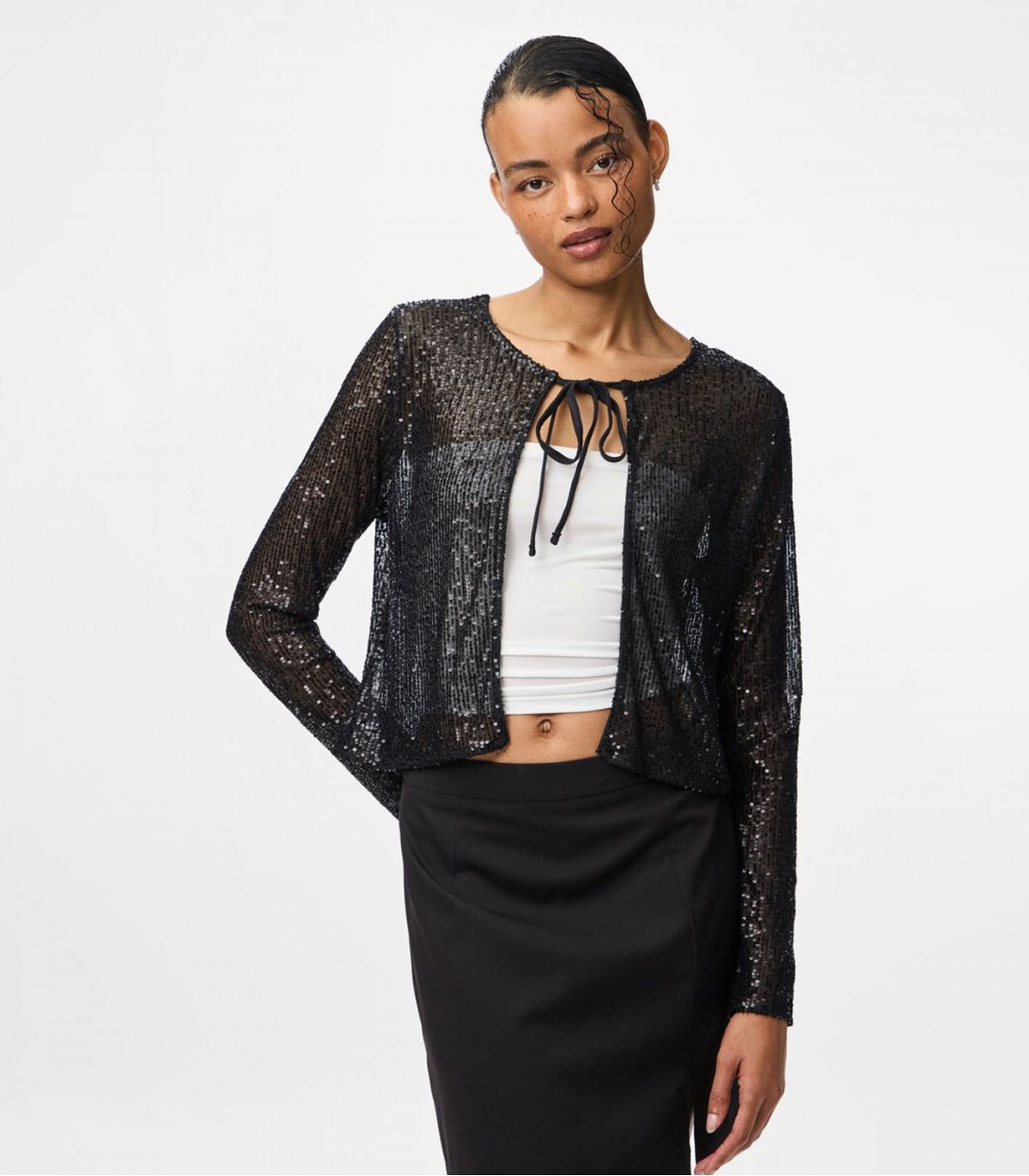 Празднично сверкающий женский кардиган. Полупрозрачная ткань украшена мелкими пайетками, которые, играя на свету, создают нежное мерцание. Вырез горловины затягивается шнурком, что подчеркивает минималистичный, но женственный стиль.