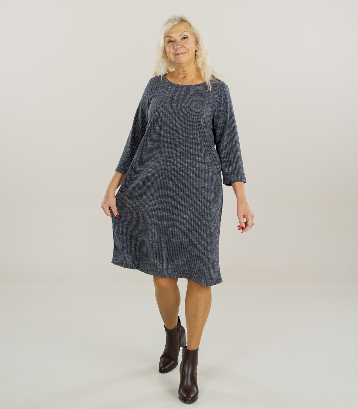 Элегантное платье для женщин с меланжевым оттенком. Выполнен из мягкого полиэстера с добавлением эластана, что придаёт легкость, драпируемость и лёгкую эластичность. Свободная посадка и рукав 3/4 создают комфорт и непринуждённость. Идеален для повседневного образа и многослойного стиля.