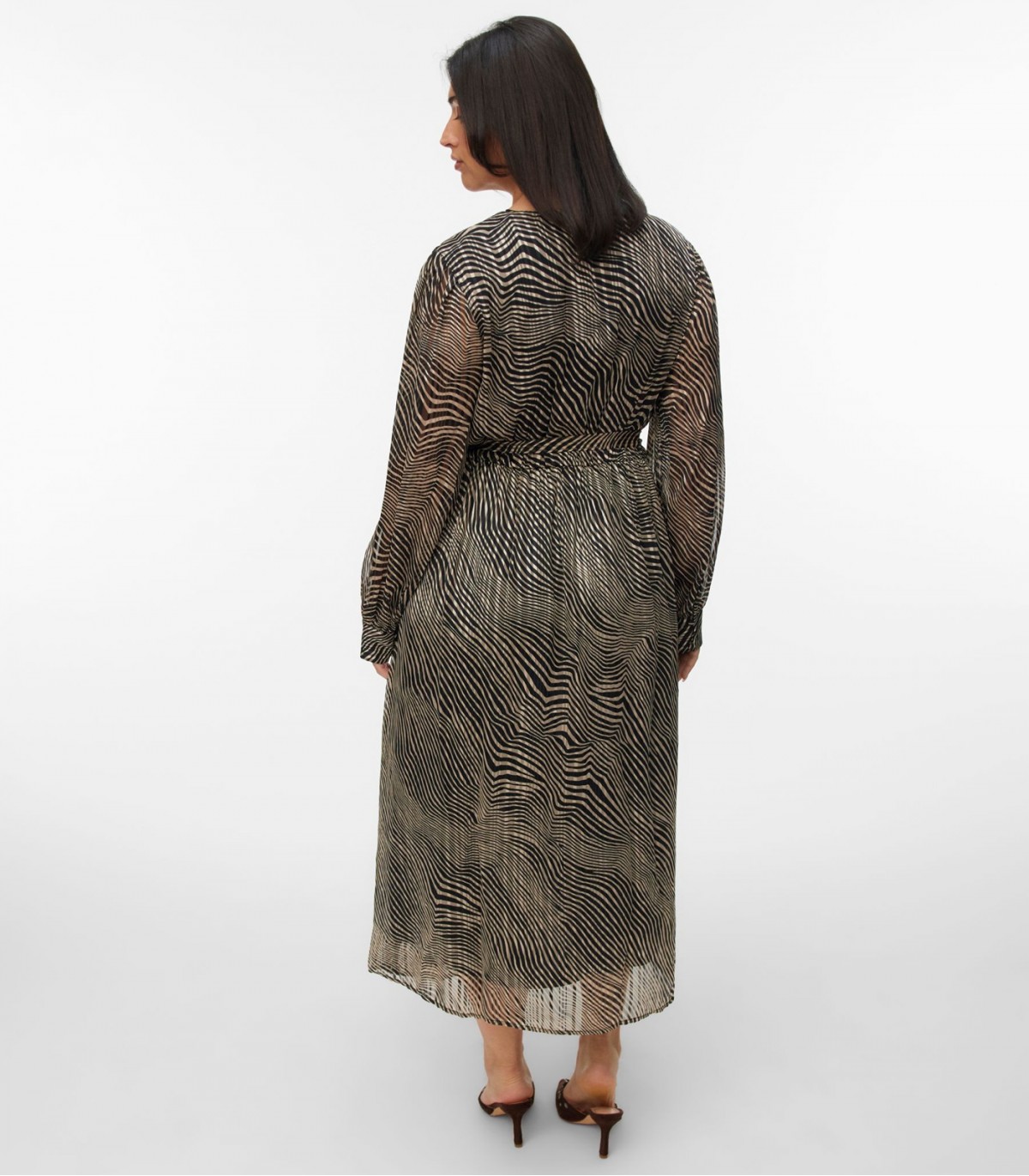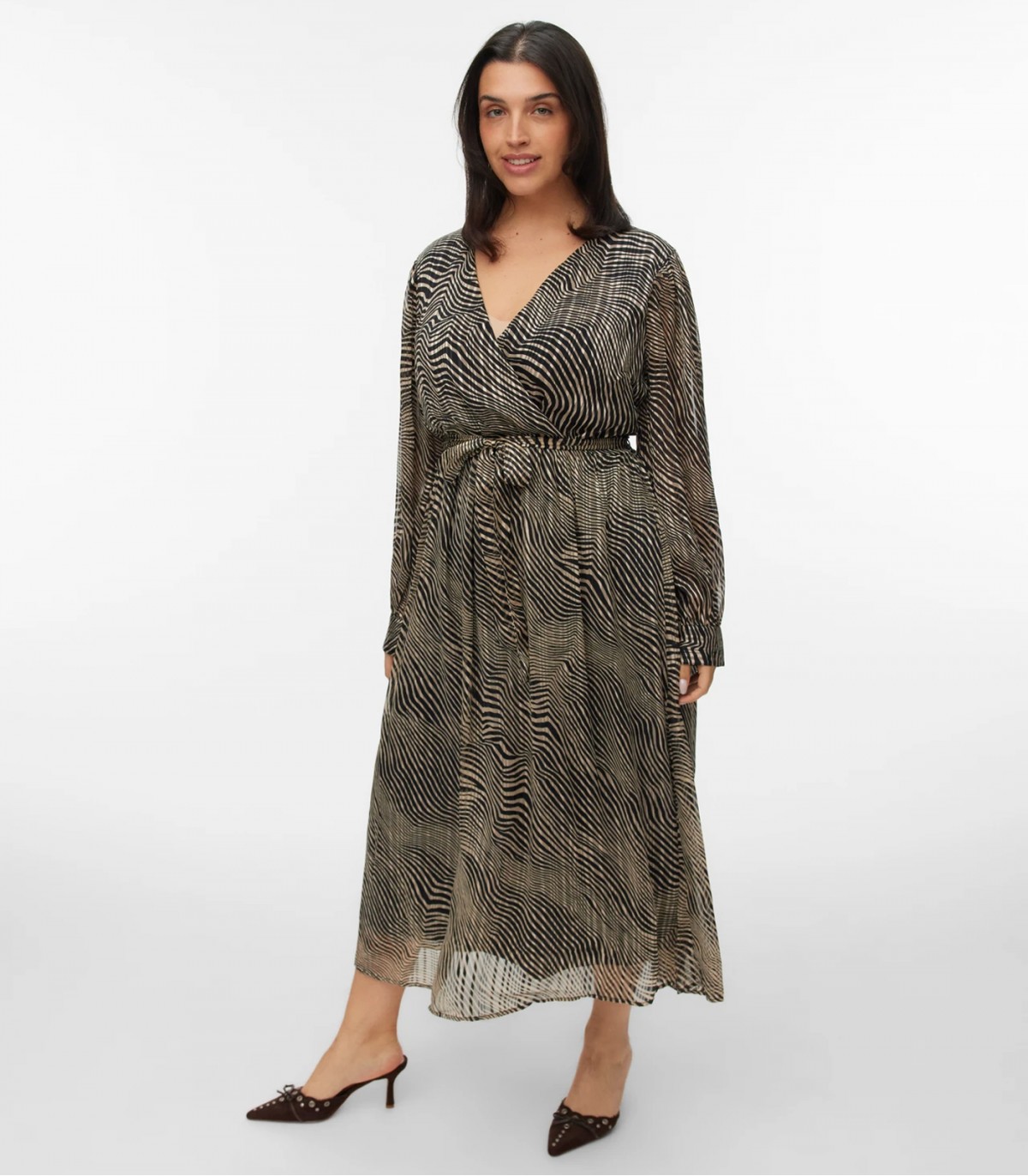 Женское платье с узором Vero Moda идеально подходит для более торжественных случаев. Платье выполнено из полупрозрачной ткани с V-образным вырезом, эластичной талией и поясом, который подчеркивает фигуру.