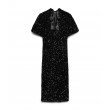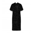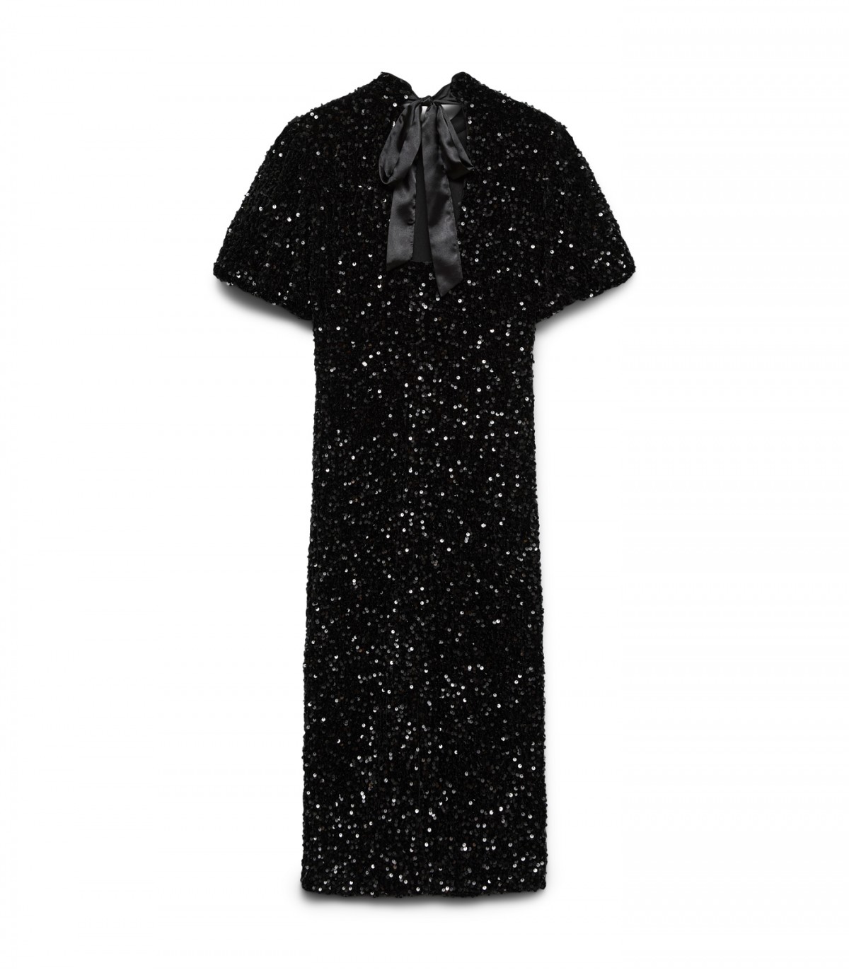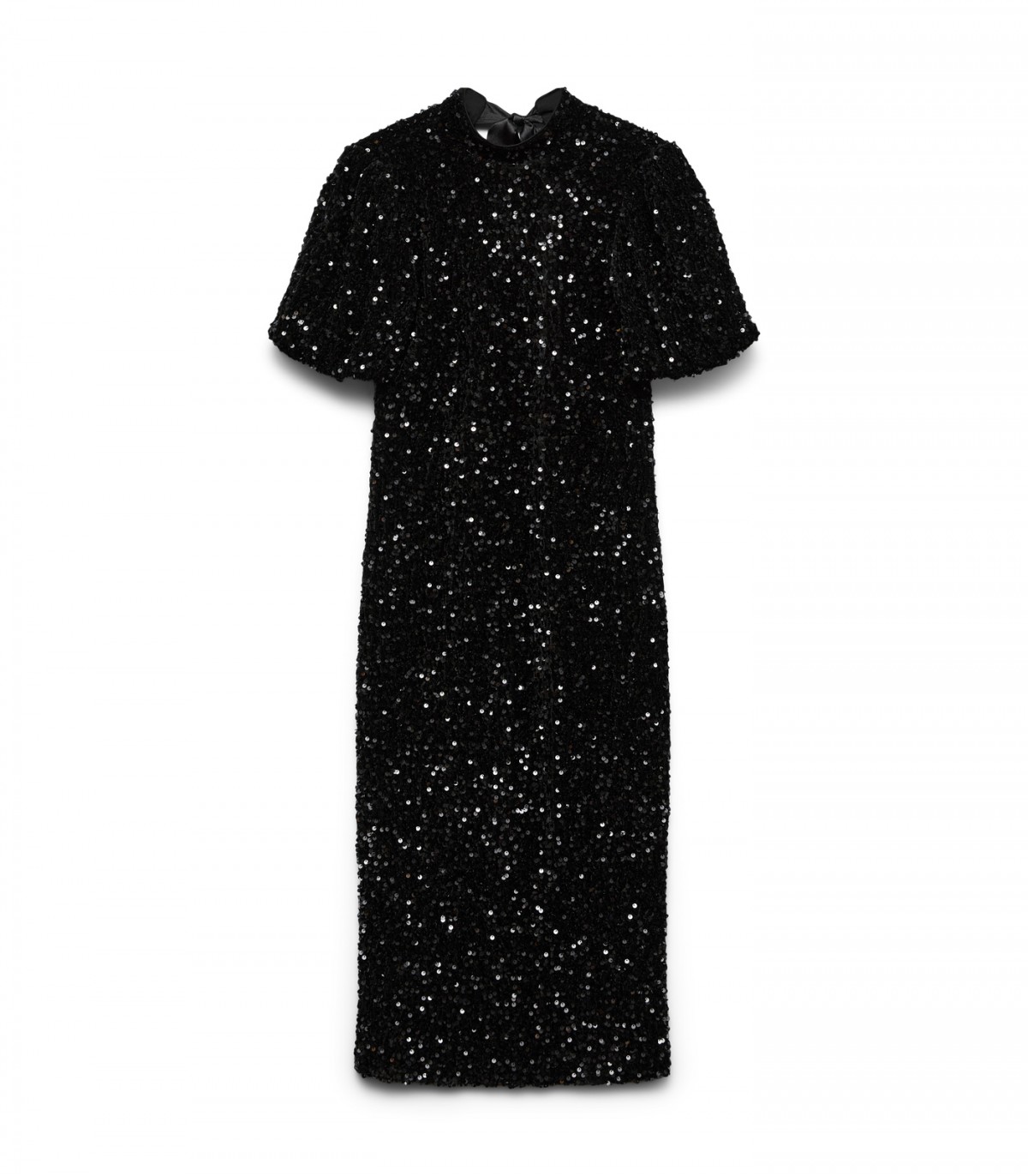 Блестящее платье с короткими рукавами для торжественных мероприятий и вечерних выходов. Ткань, расшитая пайетками, создаёт эффектный образ, а высокая горловина, украшенная завязкой, добавляет женственной элегантности.