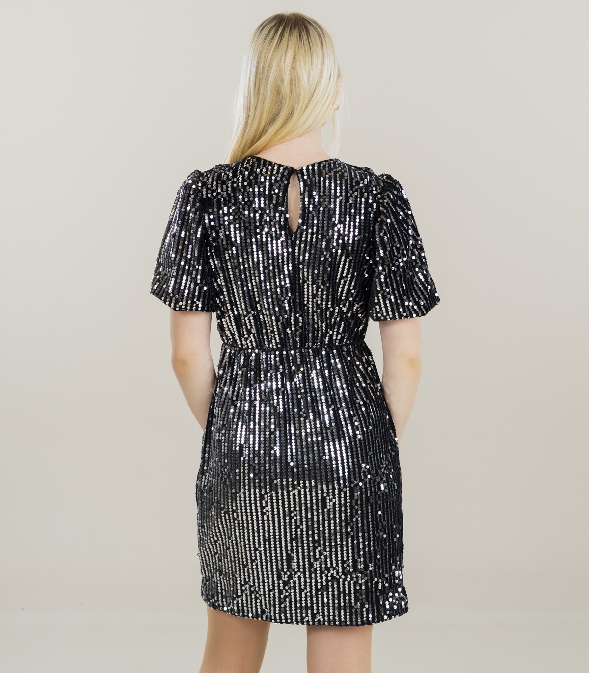 Блестящее платье с короткими рукавами, поверхность которых расшита мелкими пайетками. Платье имеет круглый вырез горловины и эластичную талию, что подчеркивает женственный силуэт. Идеально подходит для торжественных случаев и вечерних мероприятий.