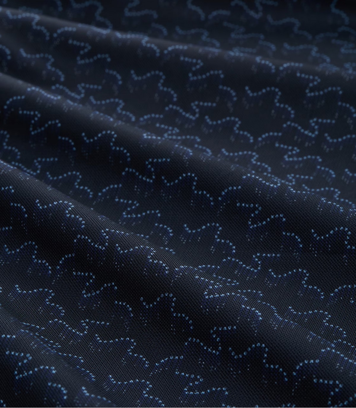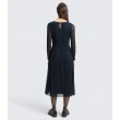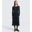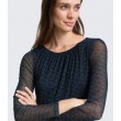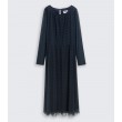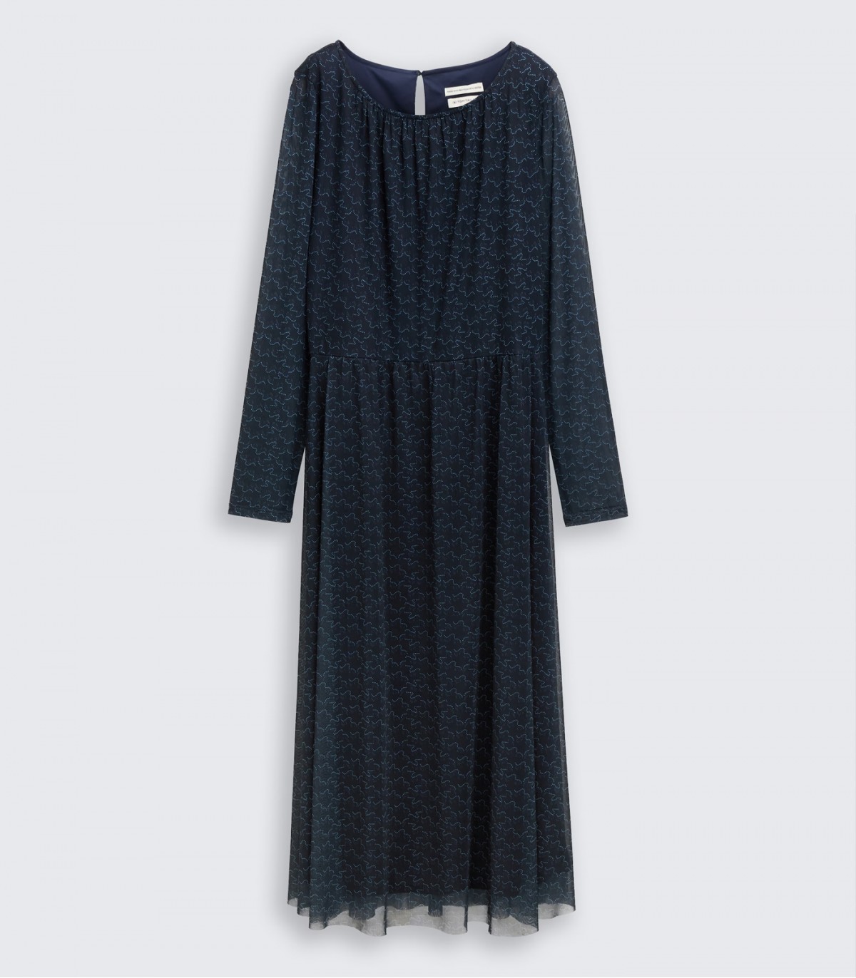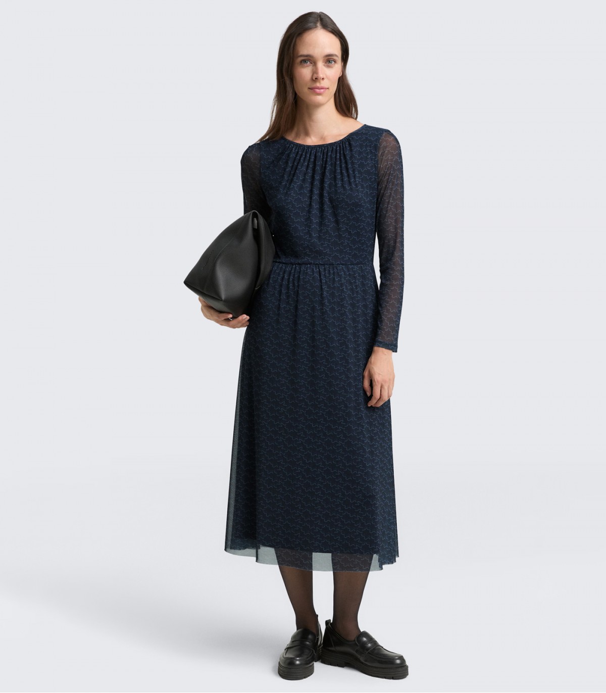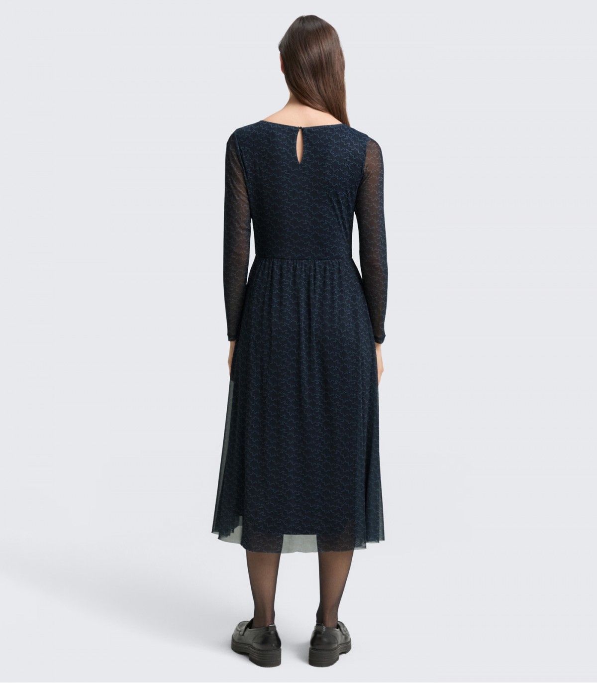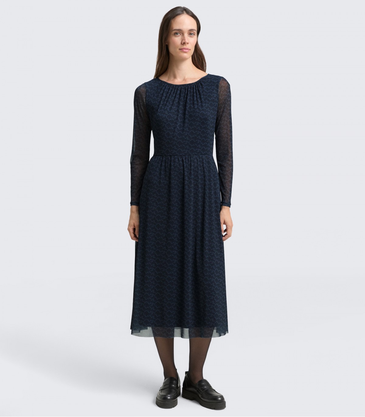 Платье миди с узором из струящейся, немнущейся сетчатой ​​ткани. Модель имеет длинные полупрозрачные рукава, застежку на небольшую пуговицу сзади и изящные складки на талии.