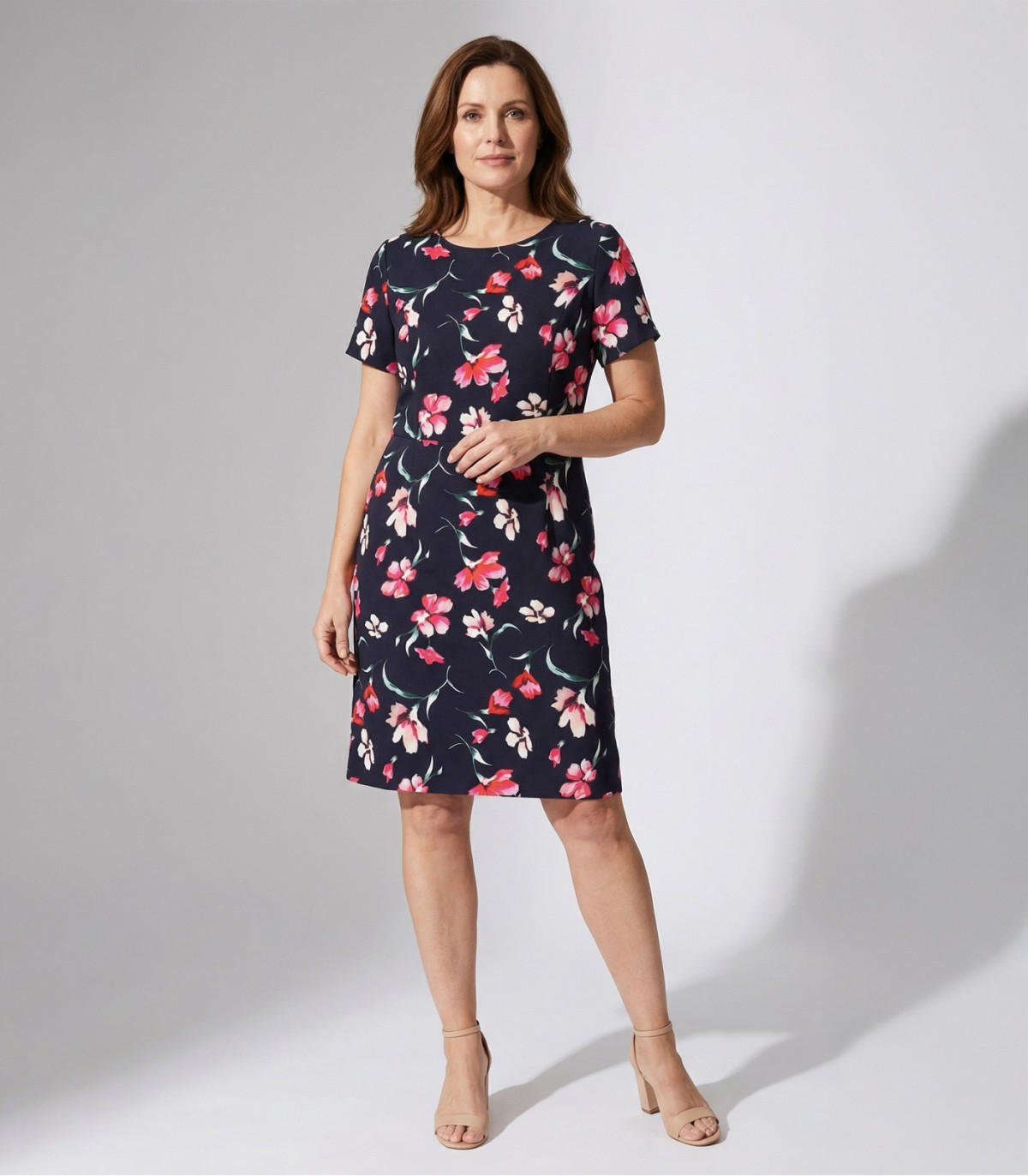 Классическое, красивое и удобное женское платье Hansmark с цветочным узором. Красно-розовый и белый цветочный узор на темно-синем фоне придает платью свежий и женственный вид. Модель прямого кроя с короткими рукавами подходит как для работы, так и для торжественных случаев.