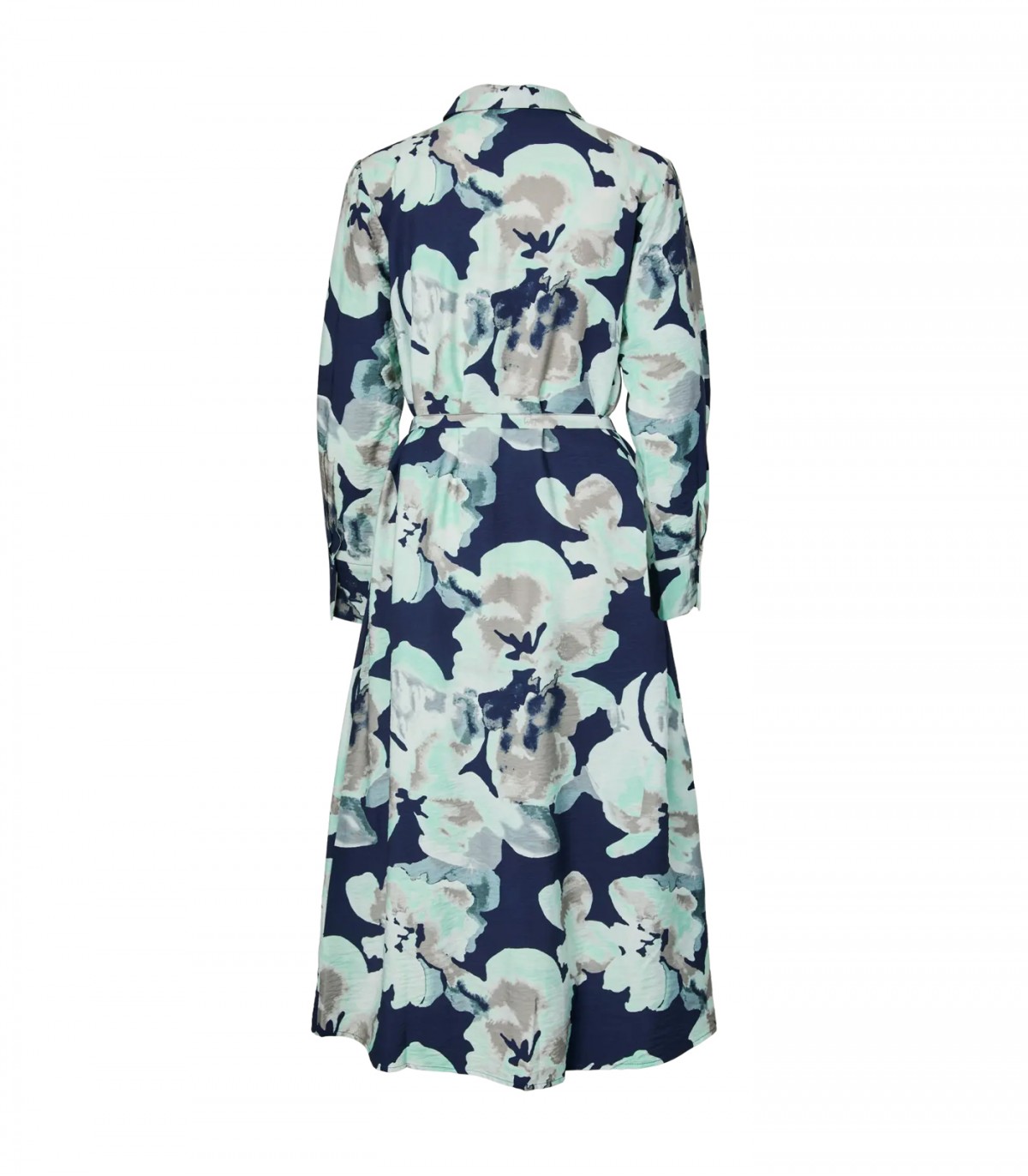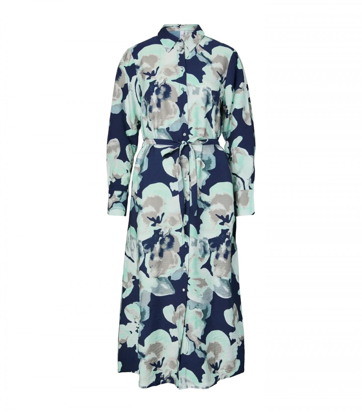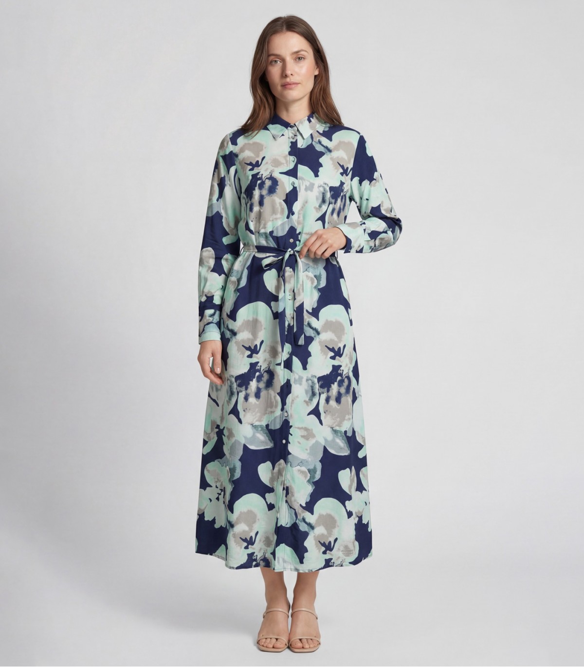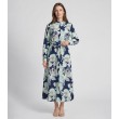 Длинное струящееся платье-рубашка с цветочным принтом подходит как для повседневной носки, так и для более торжественных случаев. Темно-синяя основа с крупными цветочными мотивами светлых тонов создает сбалансированное и привлекательное сочетание.