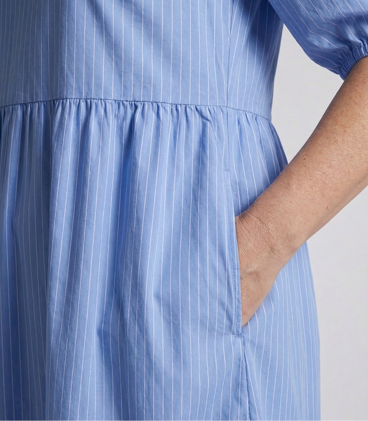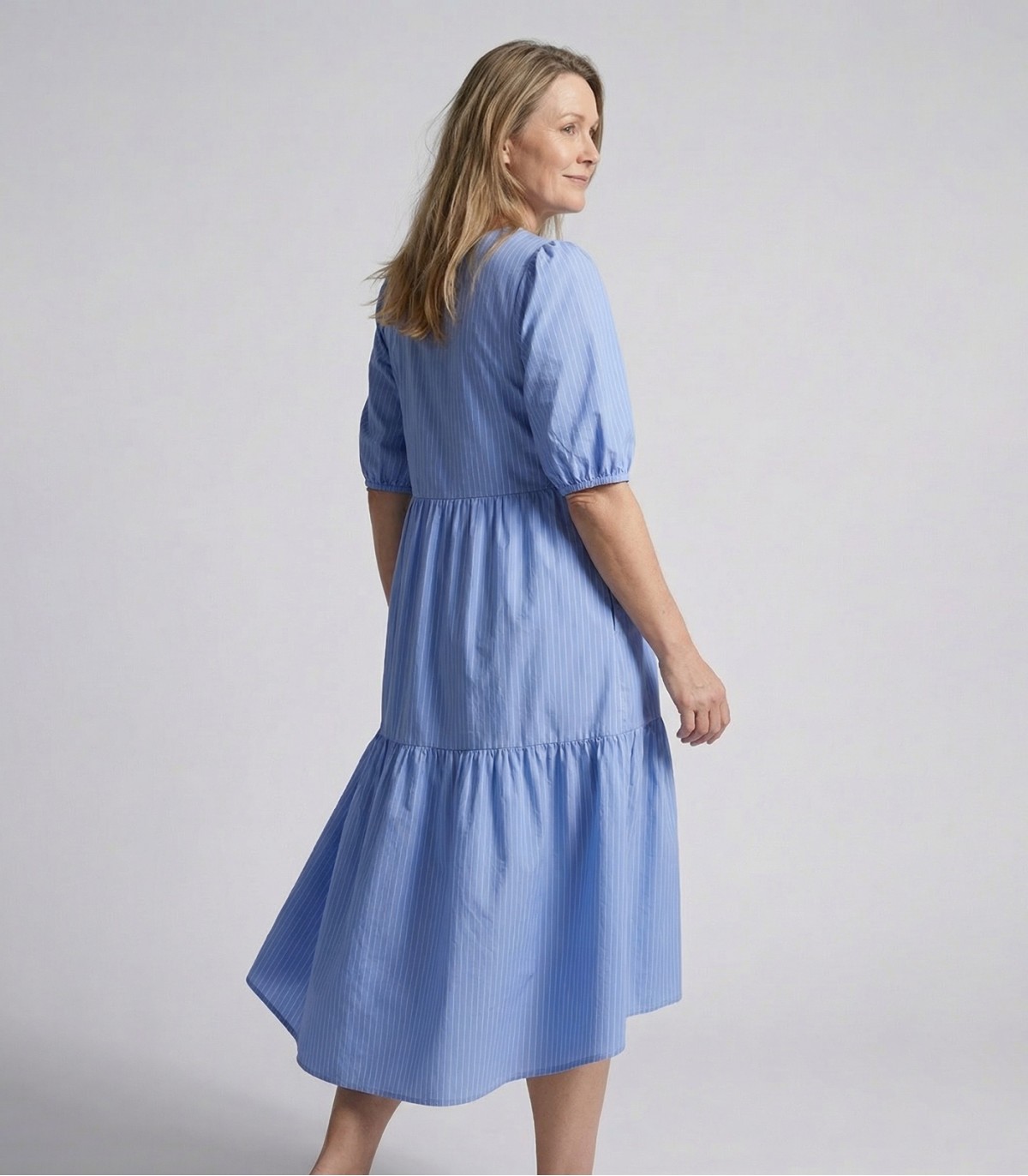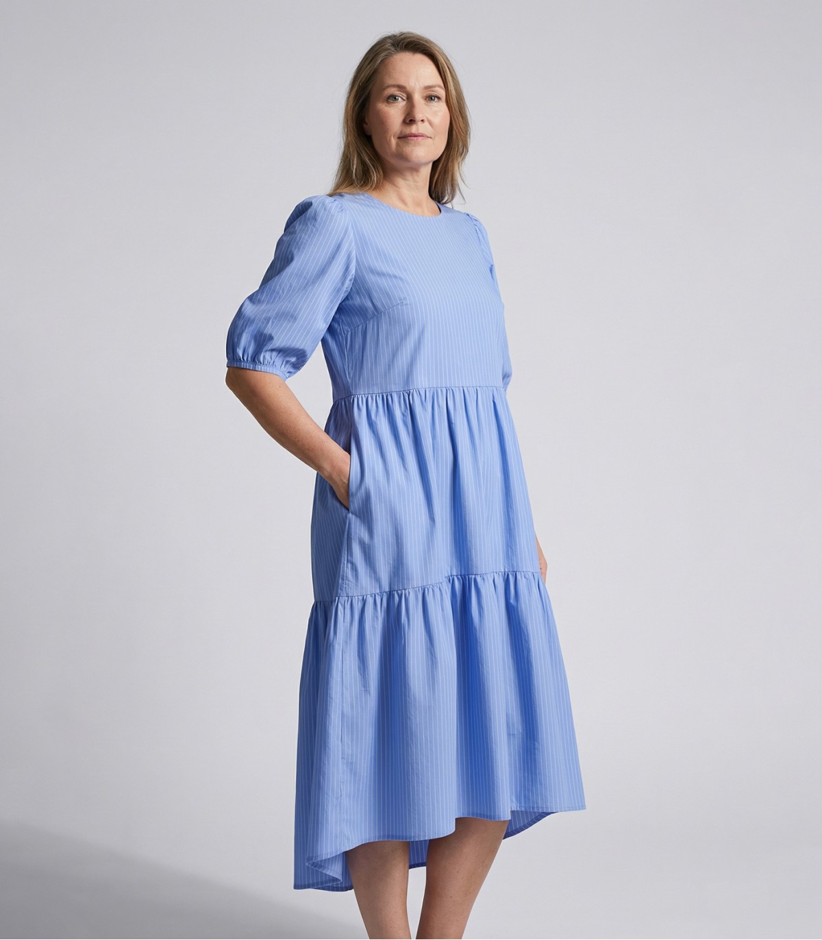 Женское платье Hansmark с хорошо сидящим кроем подходит как для рабочих дней, так и для более торжественных мероприятий. Полосатая ткань и ступенчатая юбка обеспечивают визуальную свободу движений.