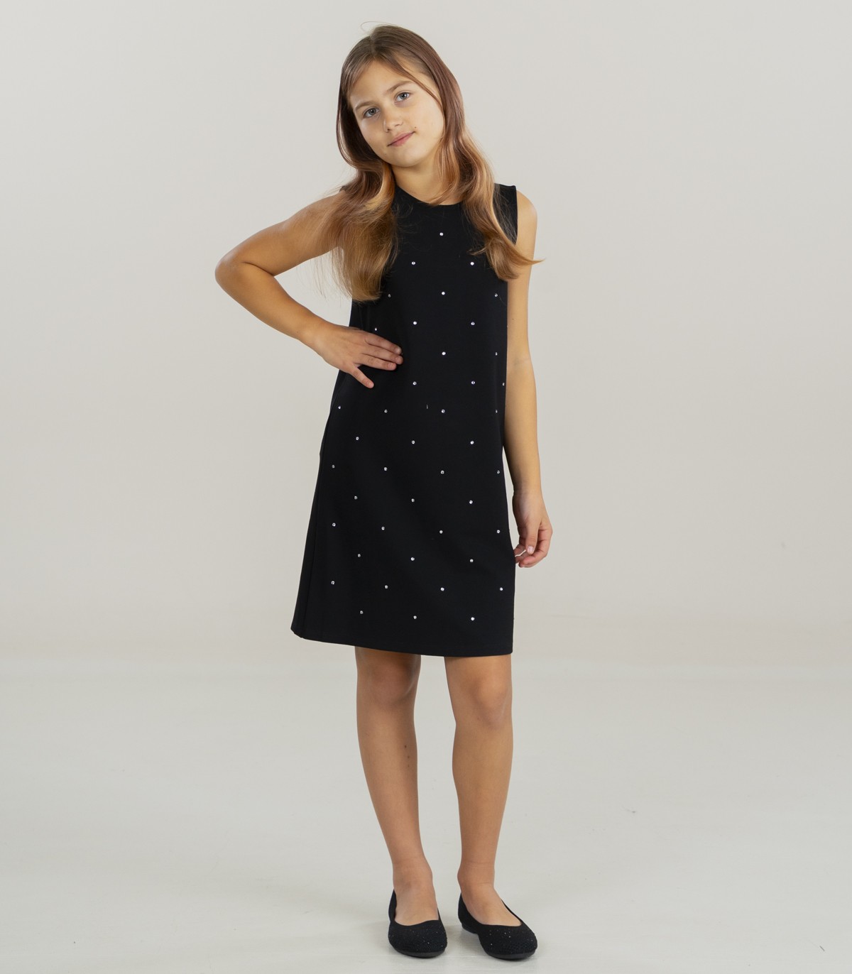 Это платье Guess для девочек простого, но элегантного дизайна идеально подходит для торжественных случаев. Черное платье украшено мелкими сверкающими камнями, которые придают образу нежный блеск. Прямой крой и модель без рукавов обеспечивают комфорт, а декоративные пуговицы на спинке придают платью особый шарм.