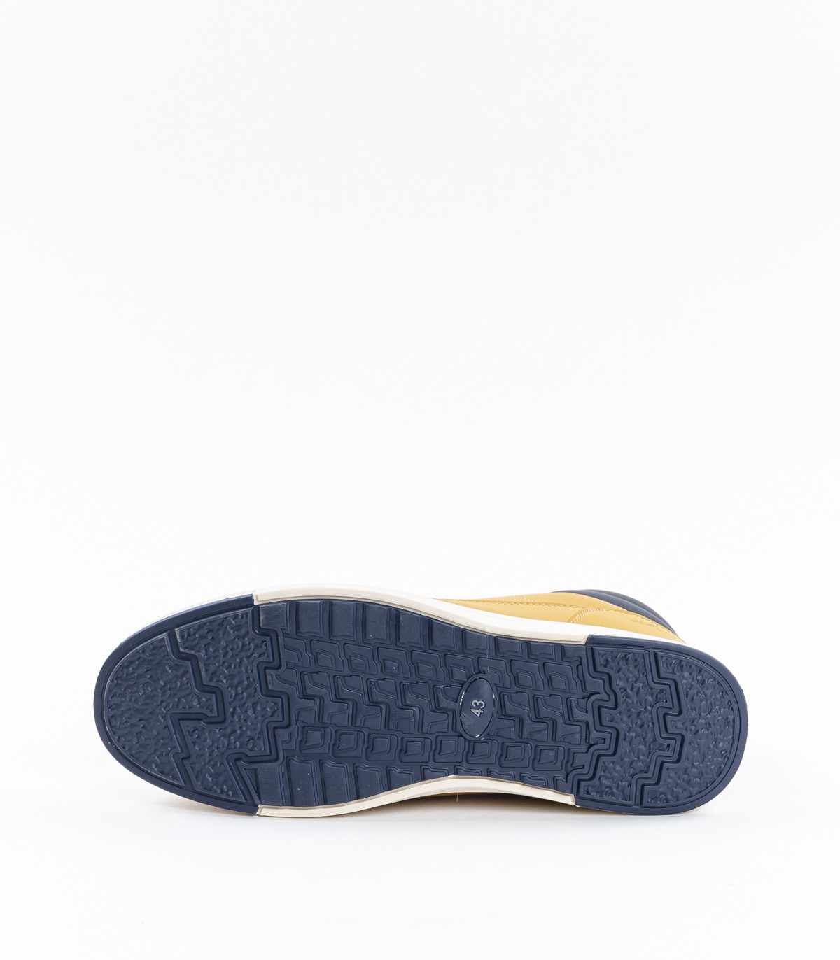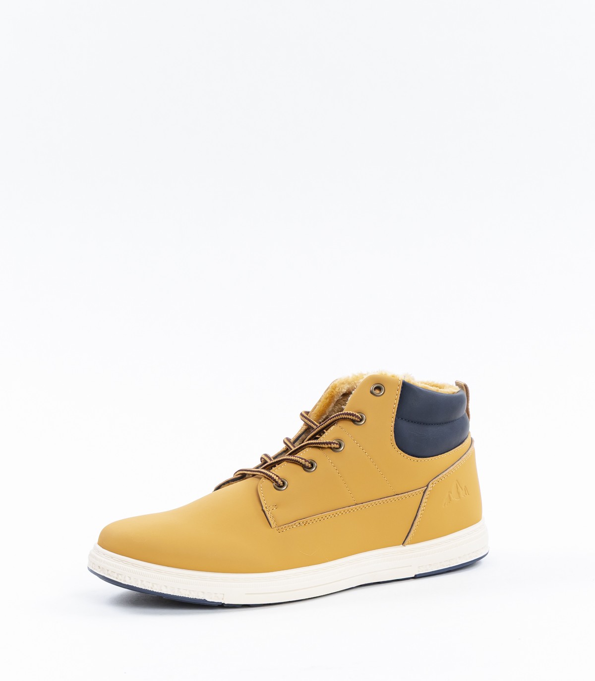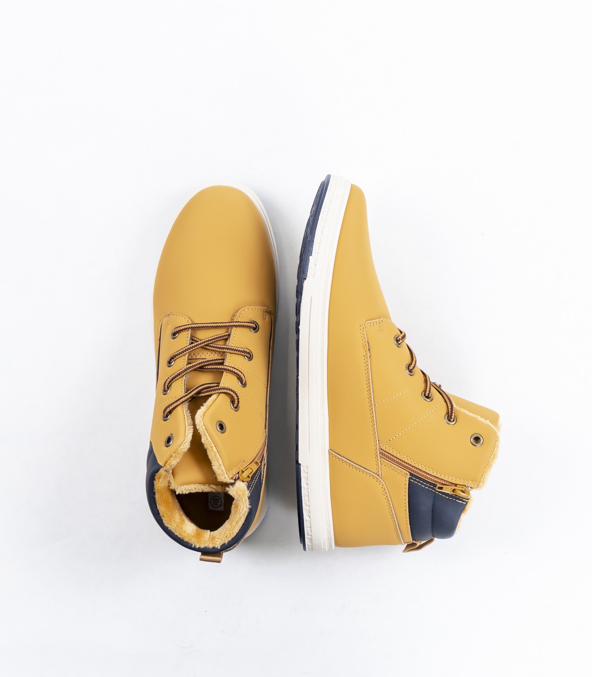 Желтые мужские ботинки с контрастной темно-синей деталью сзади. Теплая внутренняя подкладка и удобная подошва подойдут для повседневной носки в холодное время года.