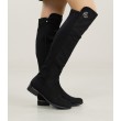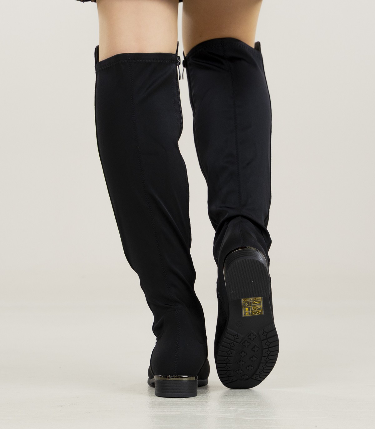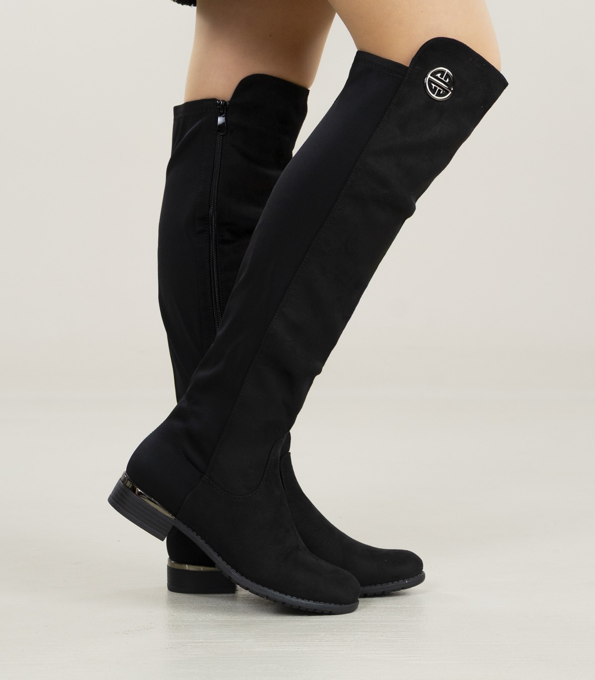 Чёрные сапоги выше колена с эластичным голенищем и боковой застёжкой-молнией.