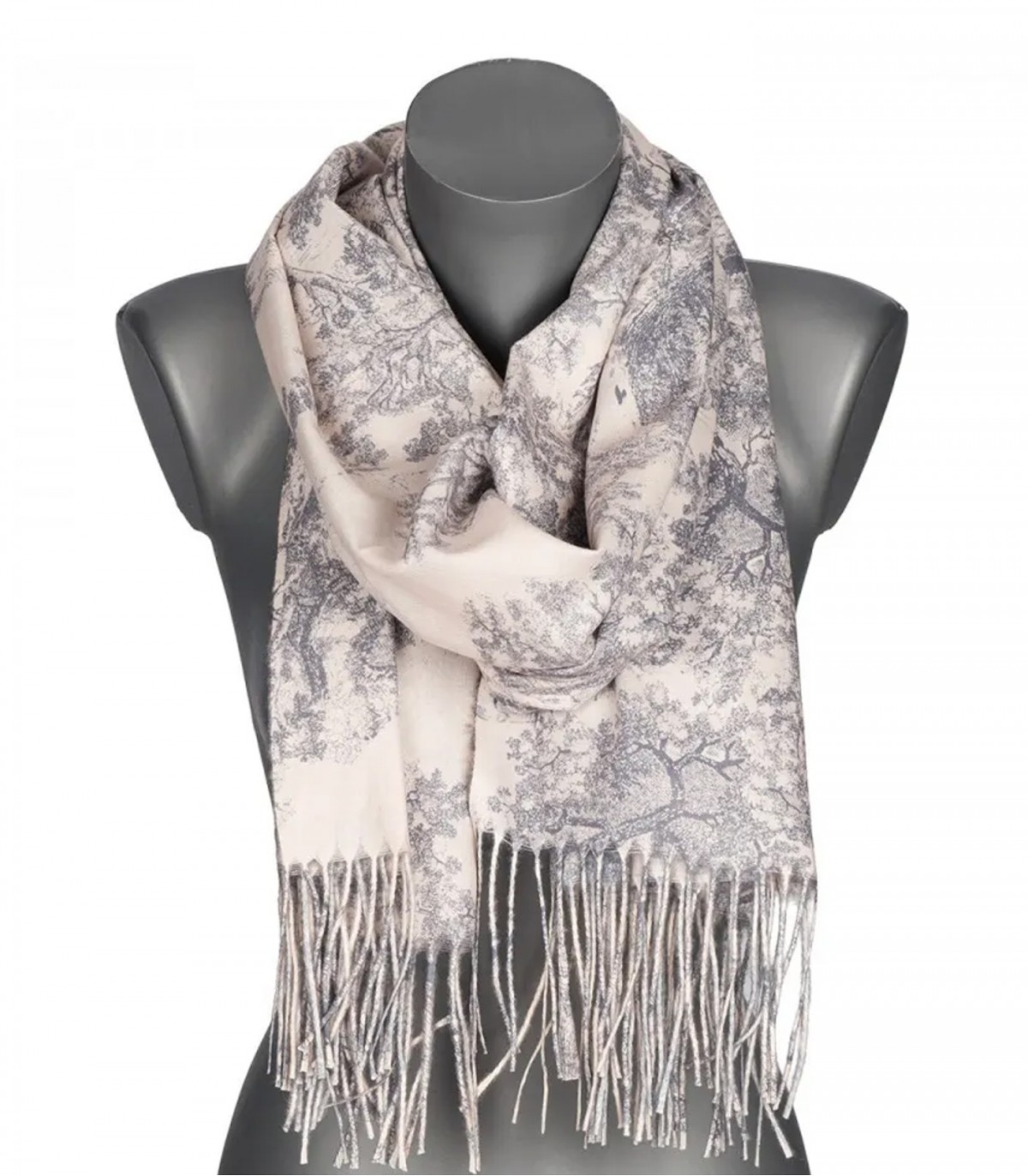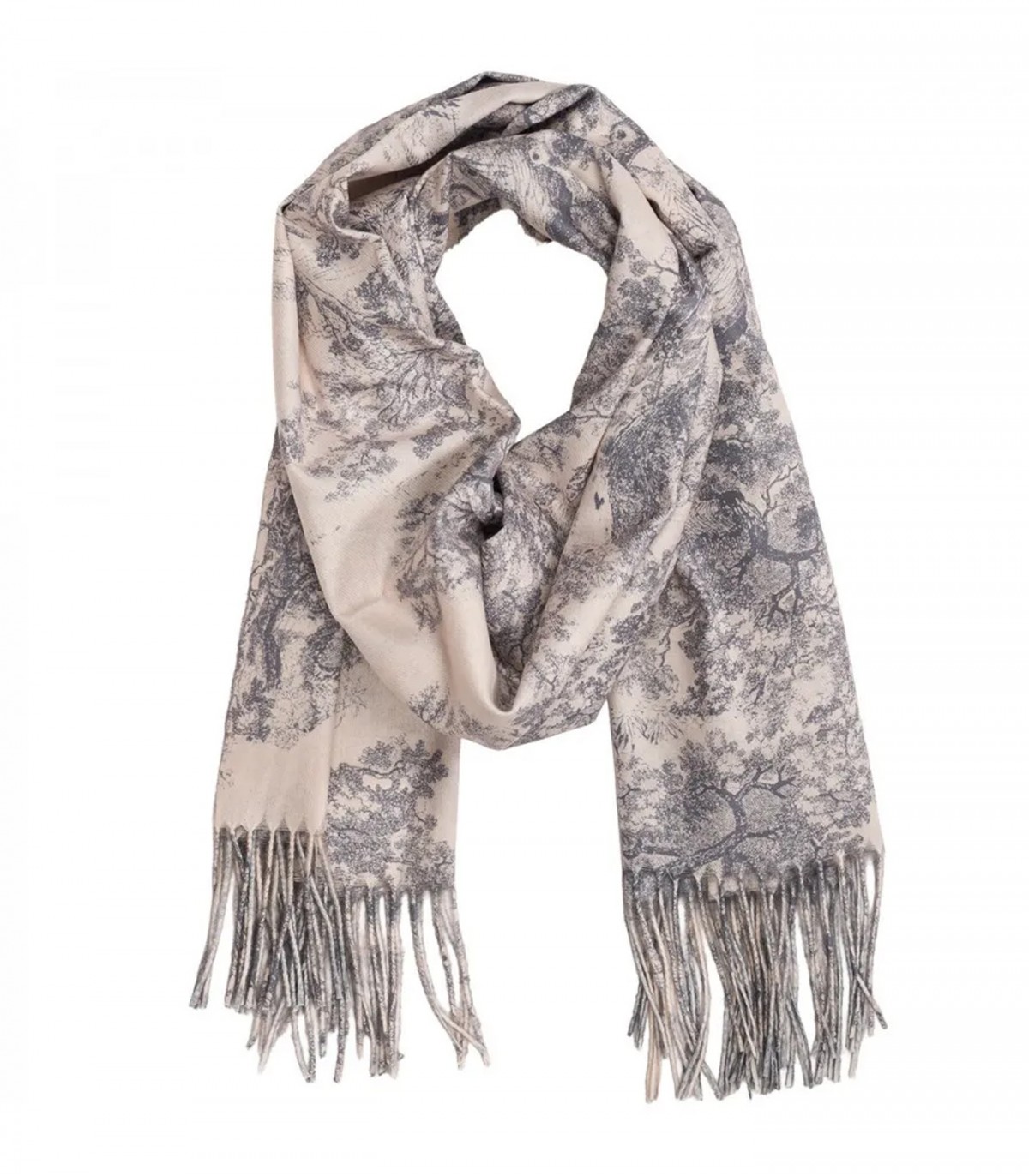 Окутайте себя мягкостью и стилем! Этот женский шарф с бахромой и уникальным дизайном: деревья и животные придают шарфу неповторимый, художественный вид.