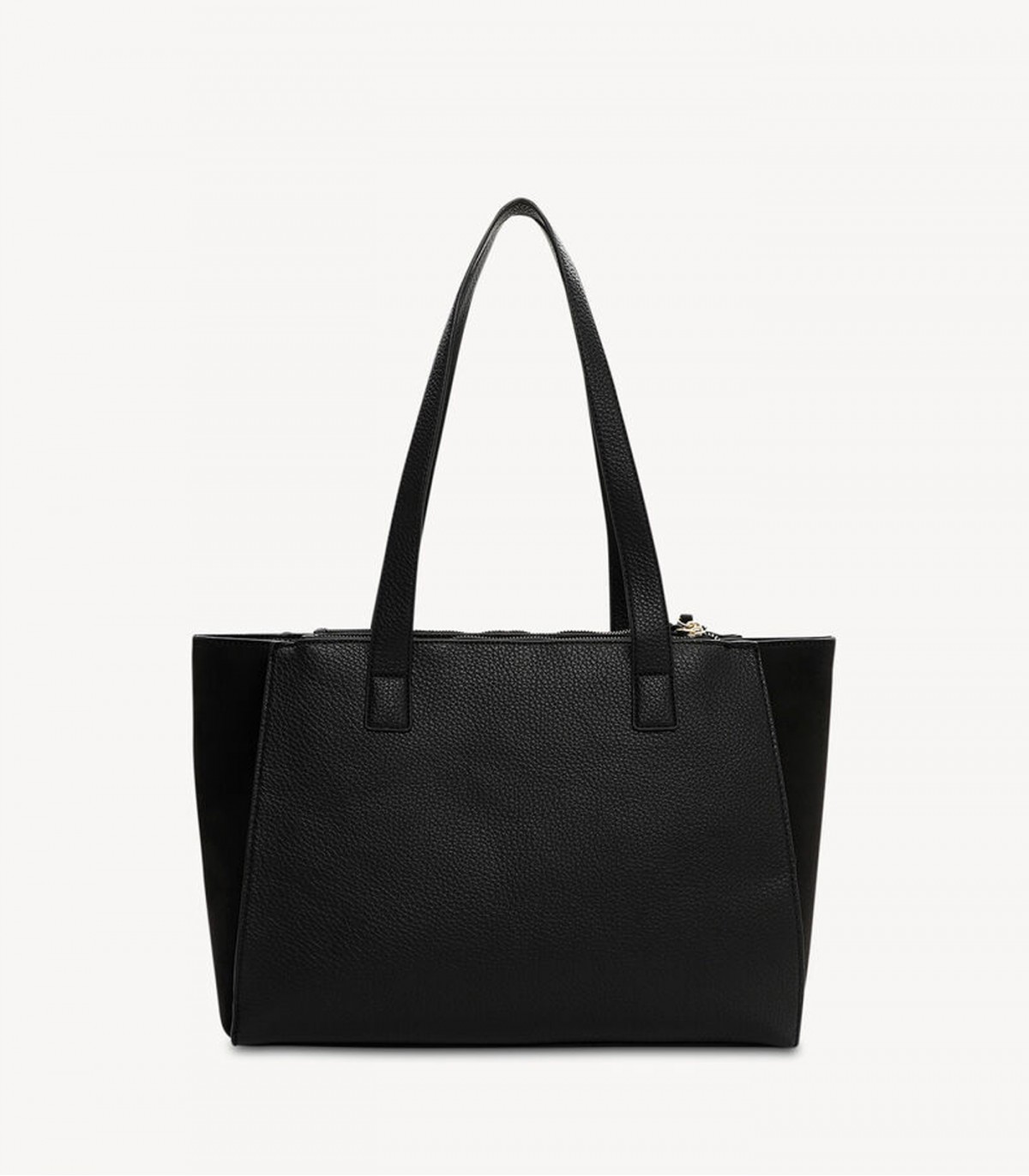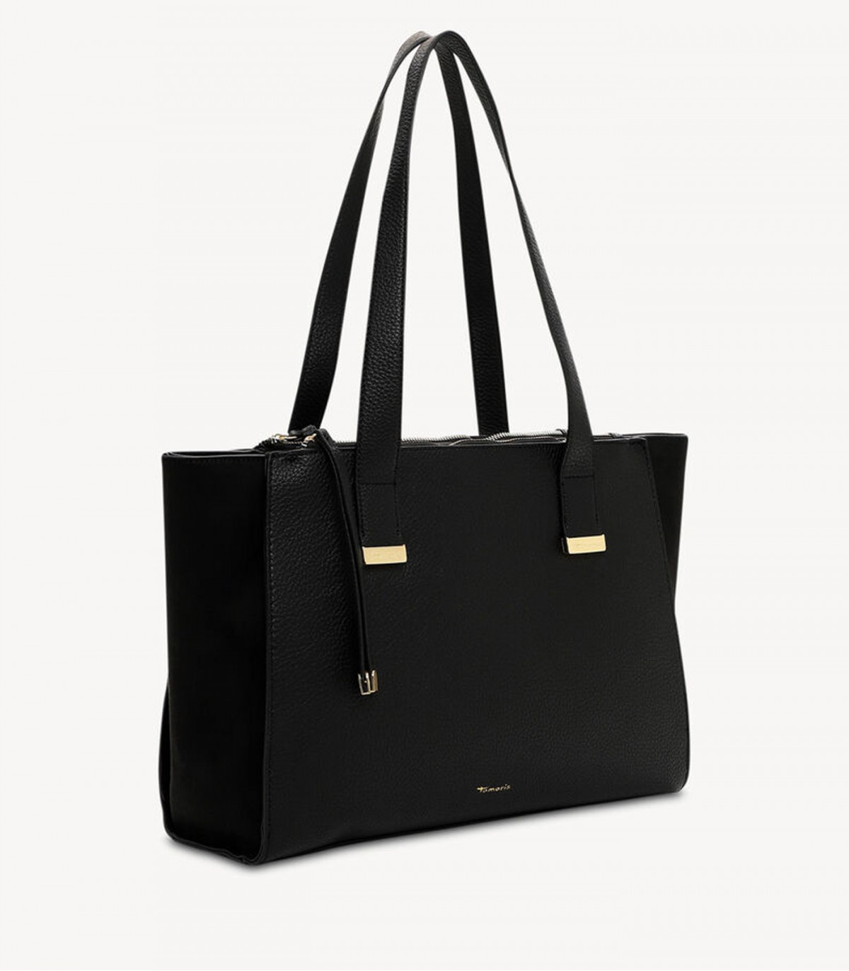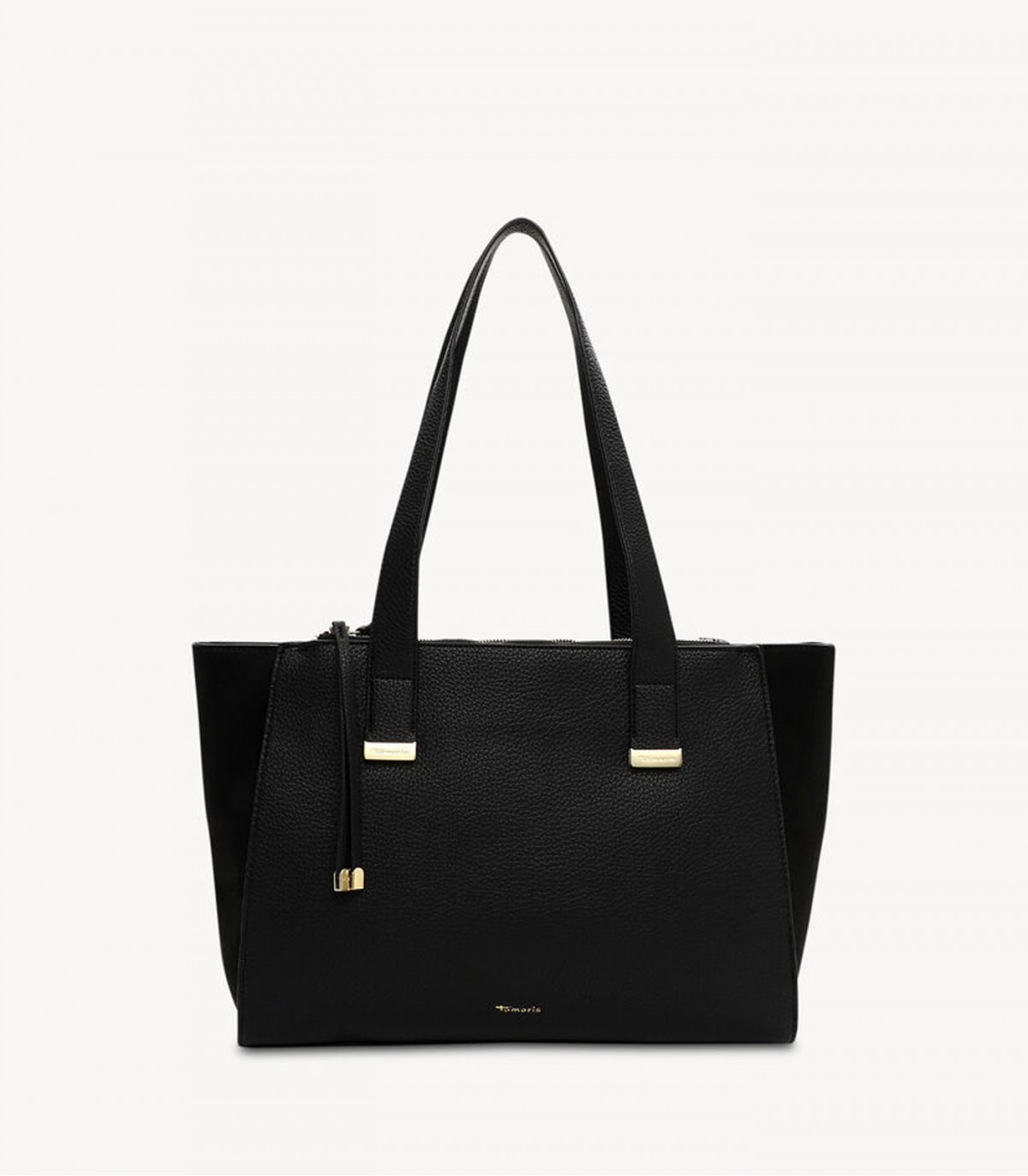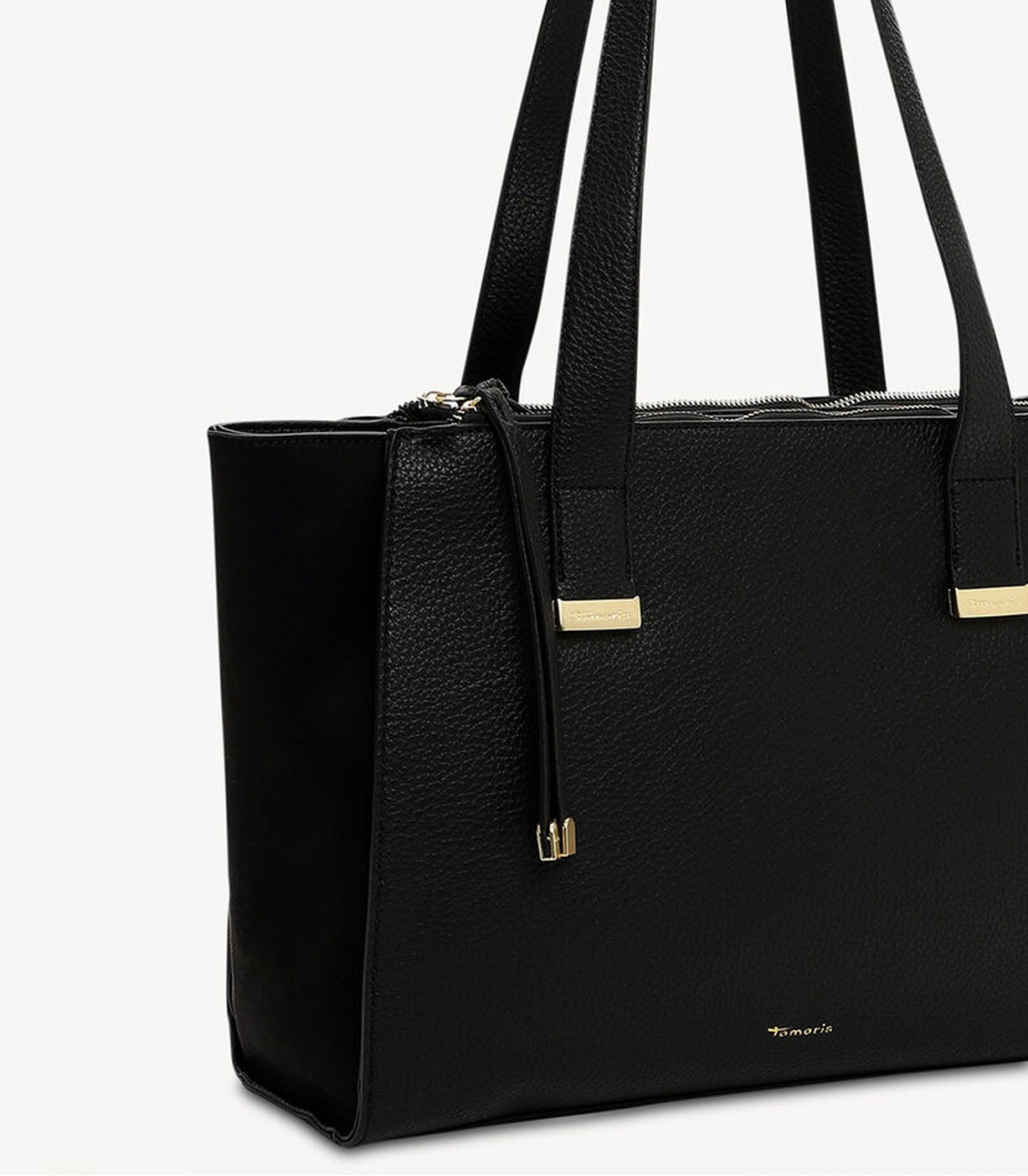 Классическая черная женская сумка идеально подходит для повседневной носки и работы. Сумка изготовлена из прочной фактурной искусственной кожи. Поверхность дополнена золотистыми металлическими деталями.