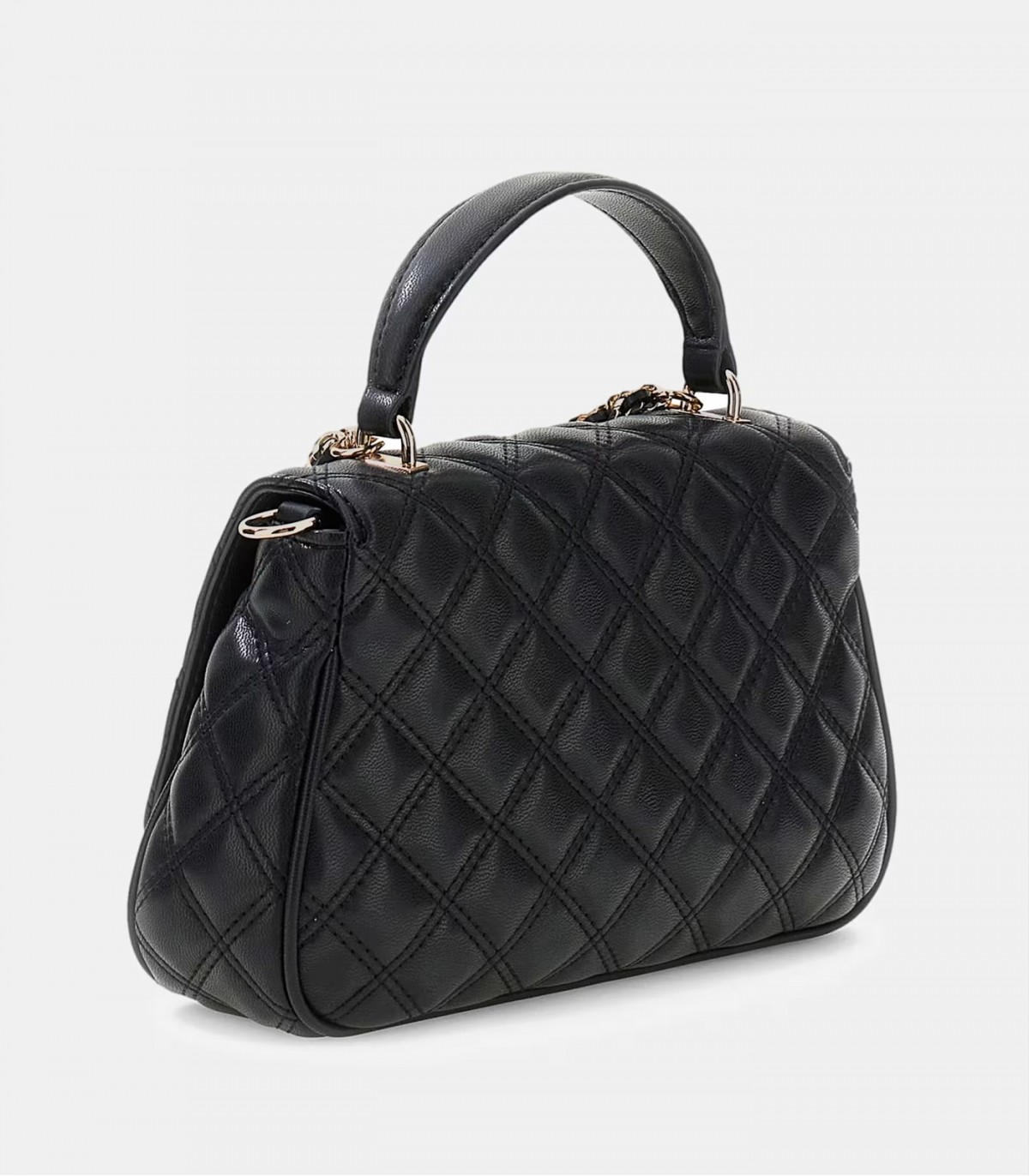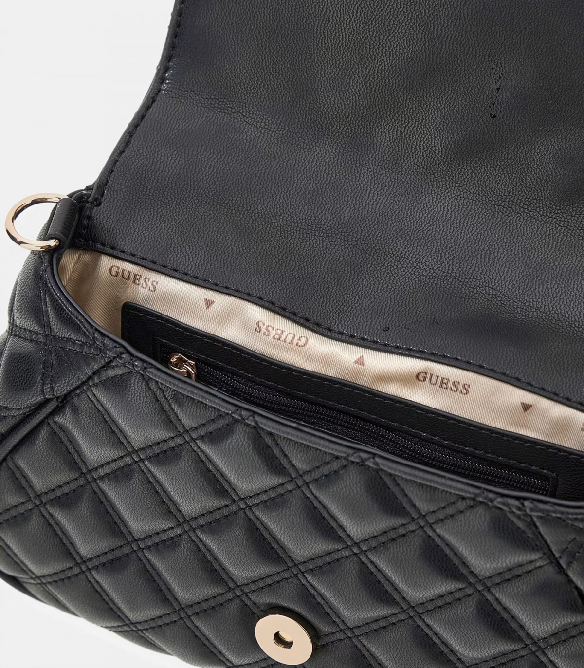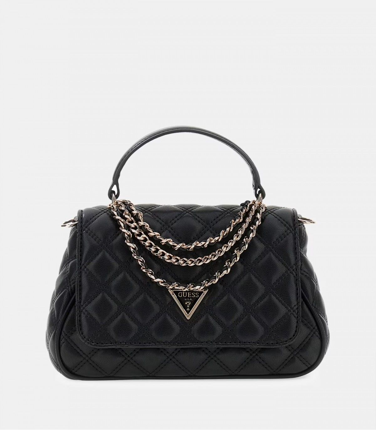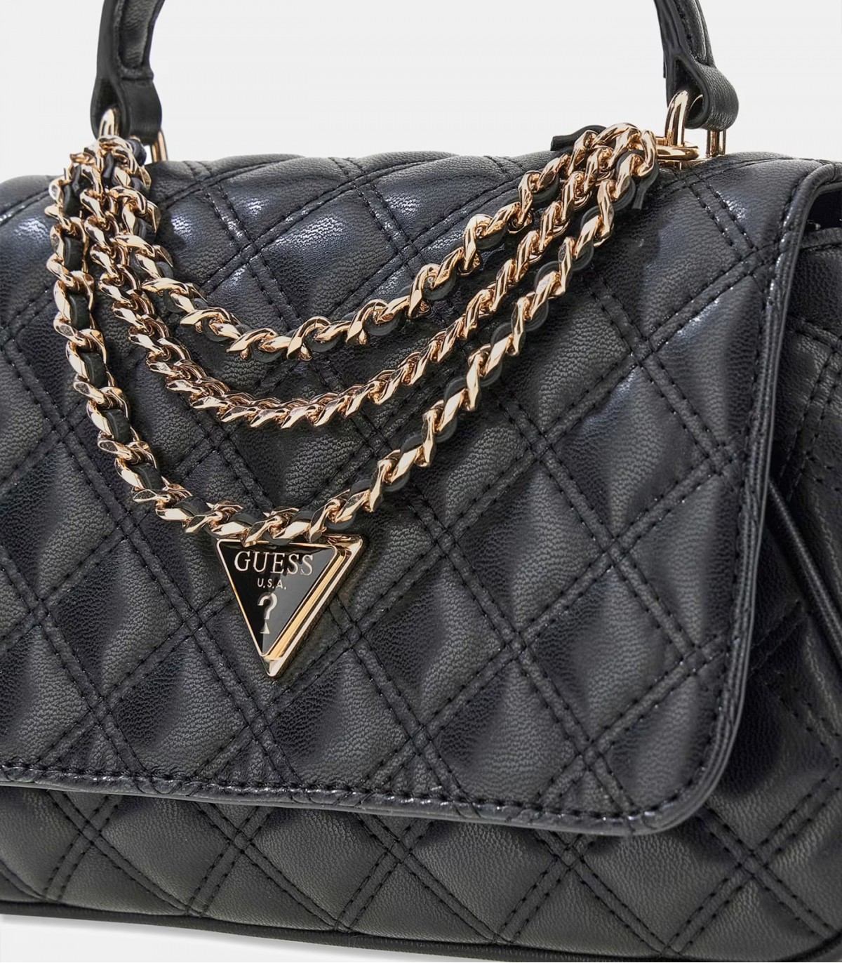 Стеганая сумка Guess из искусственной кожи, украшенная золотыми металлическими цепочками и треугольным логотипом. Компактная и элегантная, эта модель подходит как для повседневного использования, так и для торжественных случаев.