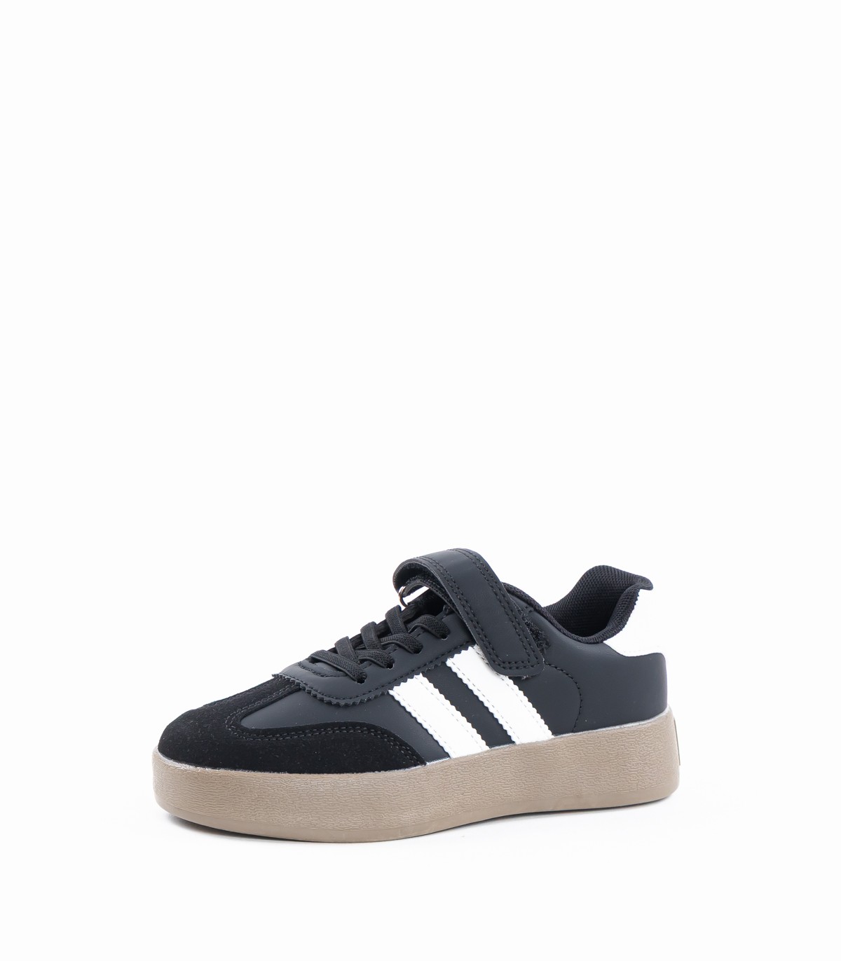 Спортивные и удобные повседневные кроссовки для мальчиков на каждый день- крашены белыми полосками по бокам и контрастной коричневой подошвой.