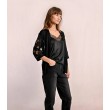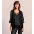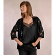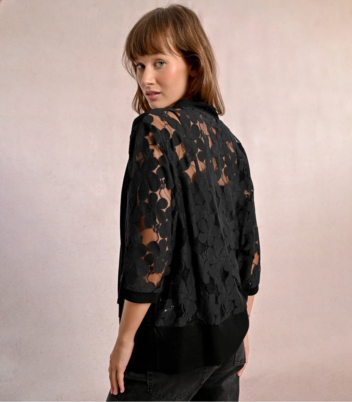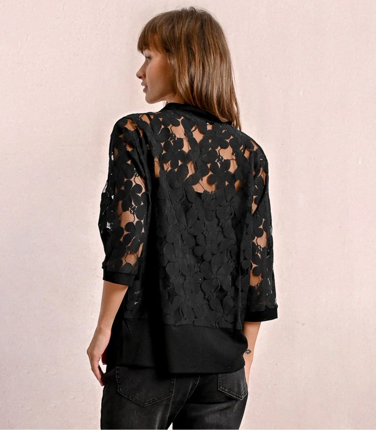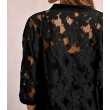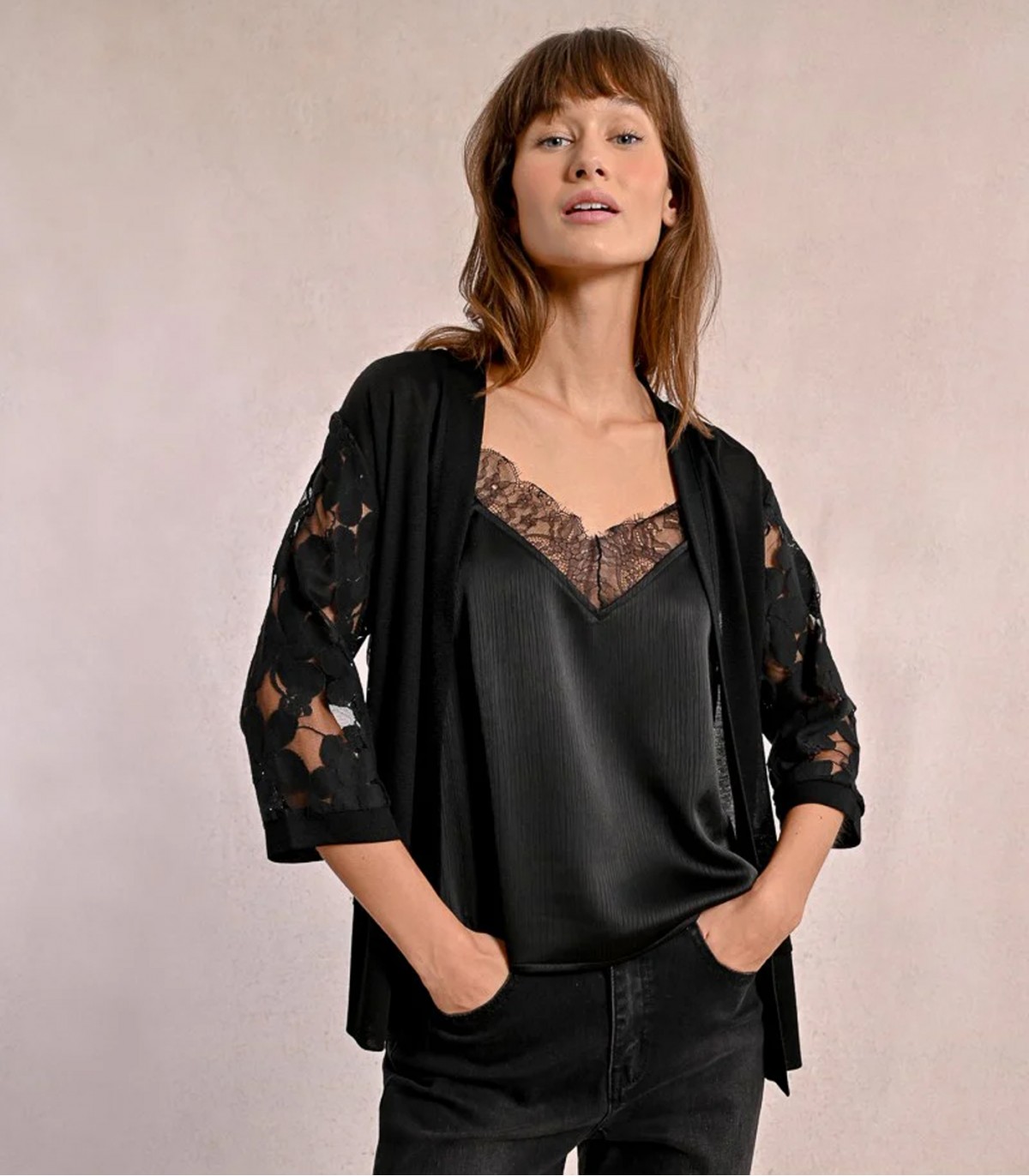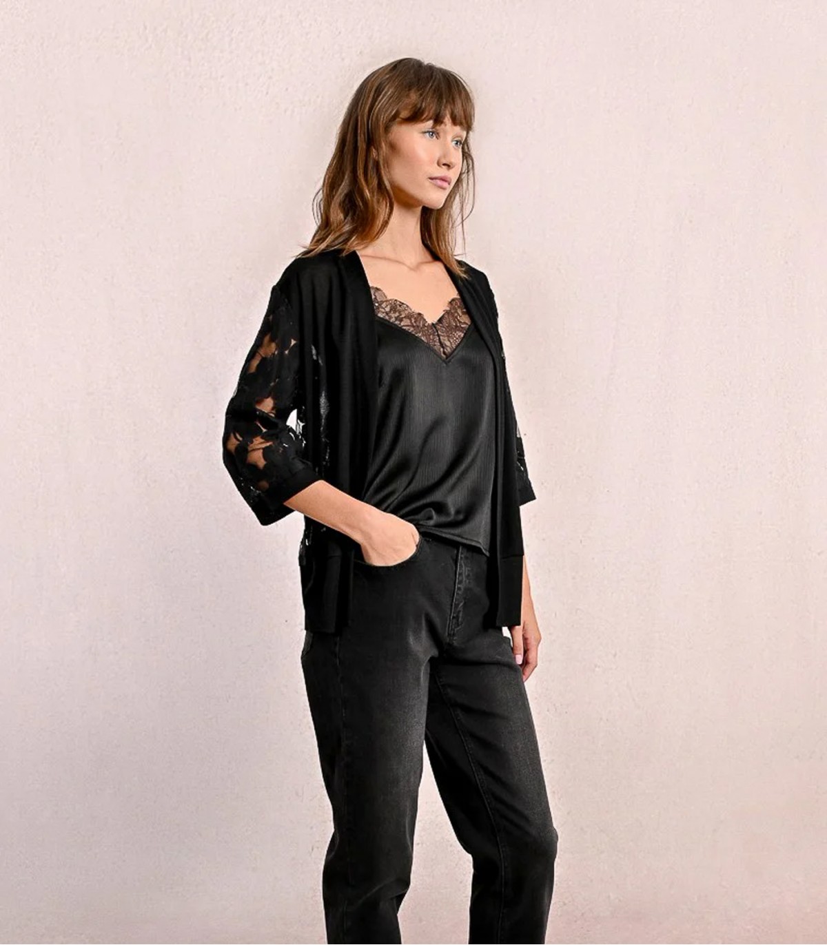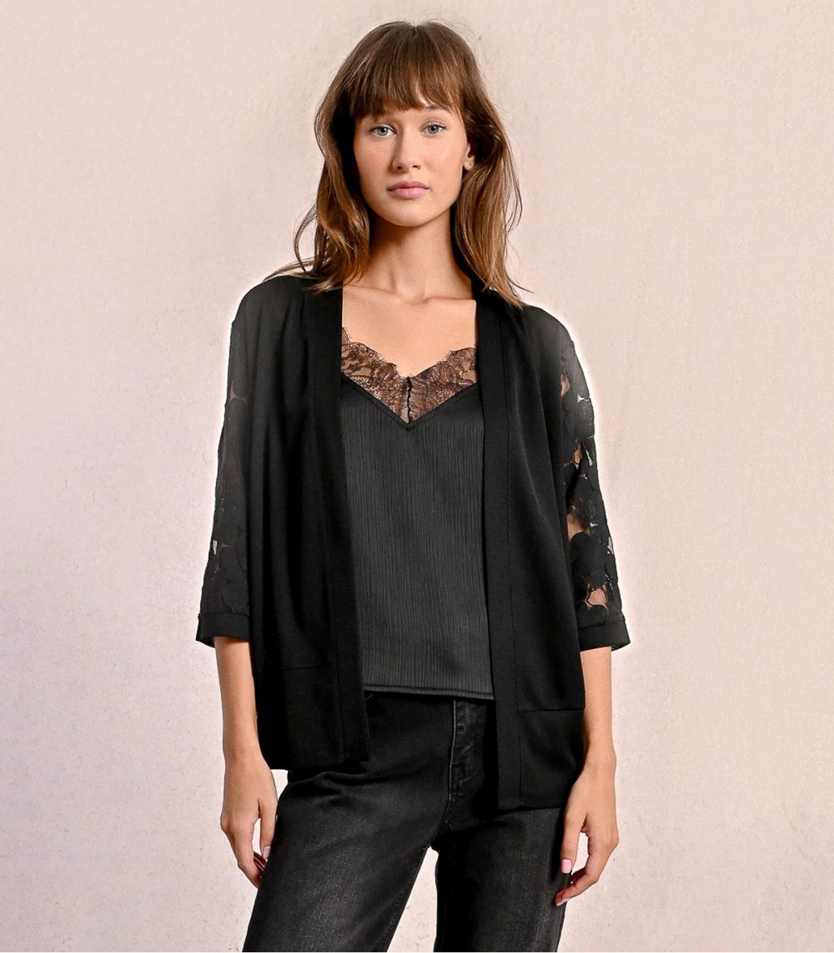 Широкий открытый кардиган с полупрозрачными вышитыми рукавами и спинкой, создающий элегантный и воздушный образ.