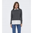 Женский джемпер ONLY 2-в-1 — оригинальная модель, которая сочетает комфорт вязаного свитера и классический стиль рубашки. Верхняя часть выполнена из мягкого трикотажа с длинными рукавами и ребристыми манжетами, а нижняя и воротник выполнены в виде вставок из ткани, имитирующих классическую рубашку. Такой дизайн создаёт эффект многослойности и добавляет образу элегантности.