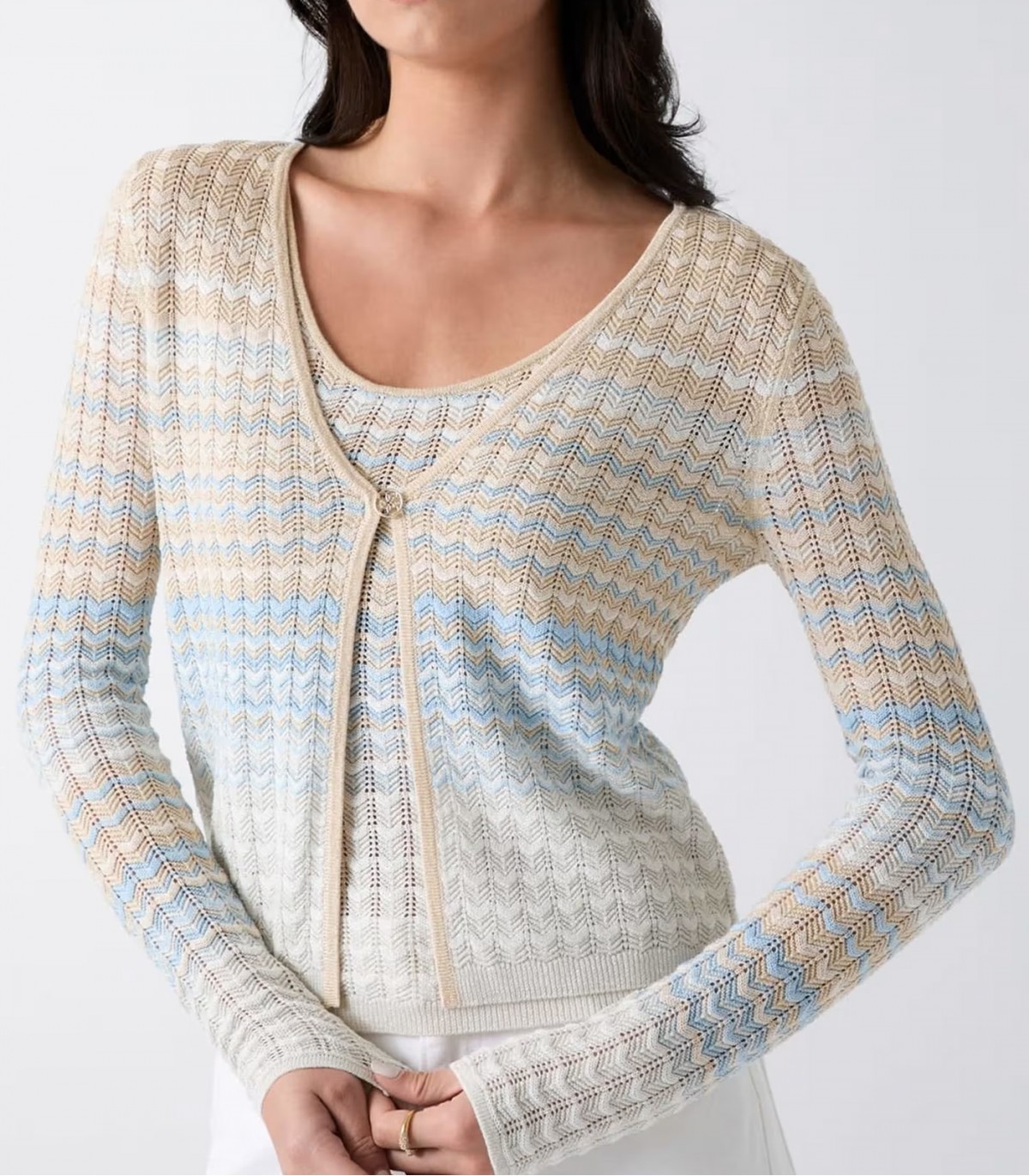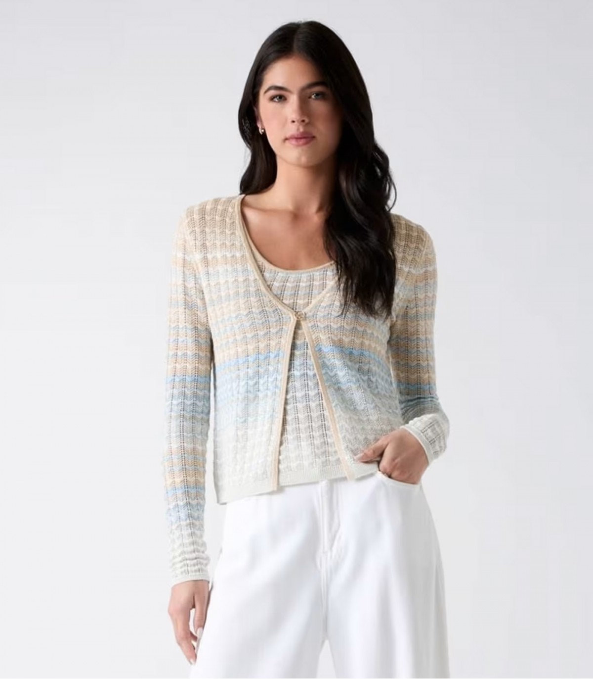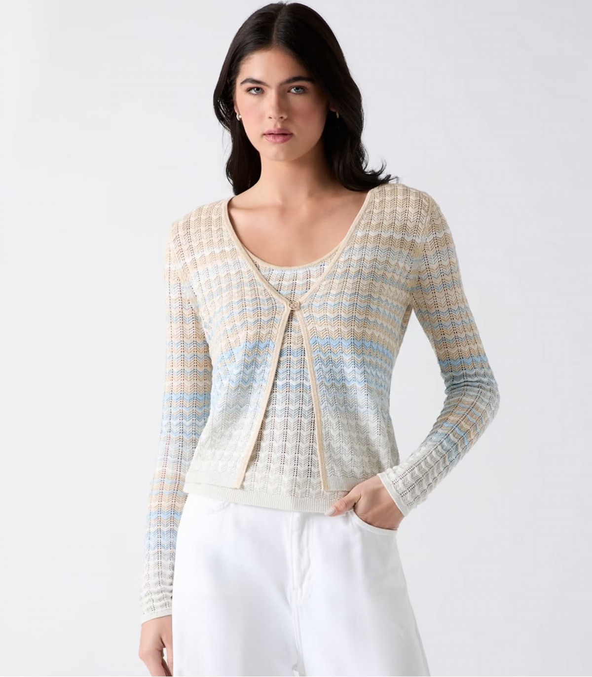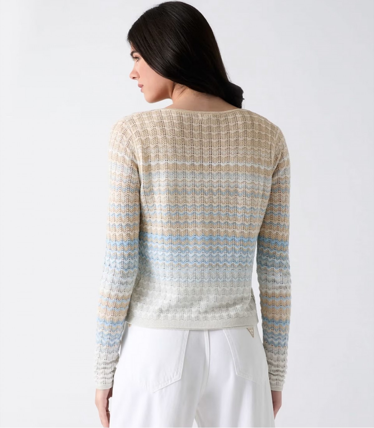 Легкий и слегка блестящий женский кардиган Guess подходит как для ношения с платьем, так и с джинсами. Тонкая вязка и люрексовая нить создают привлекательный, но сбалансированный образ.