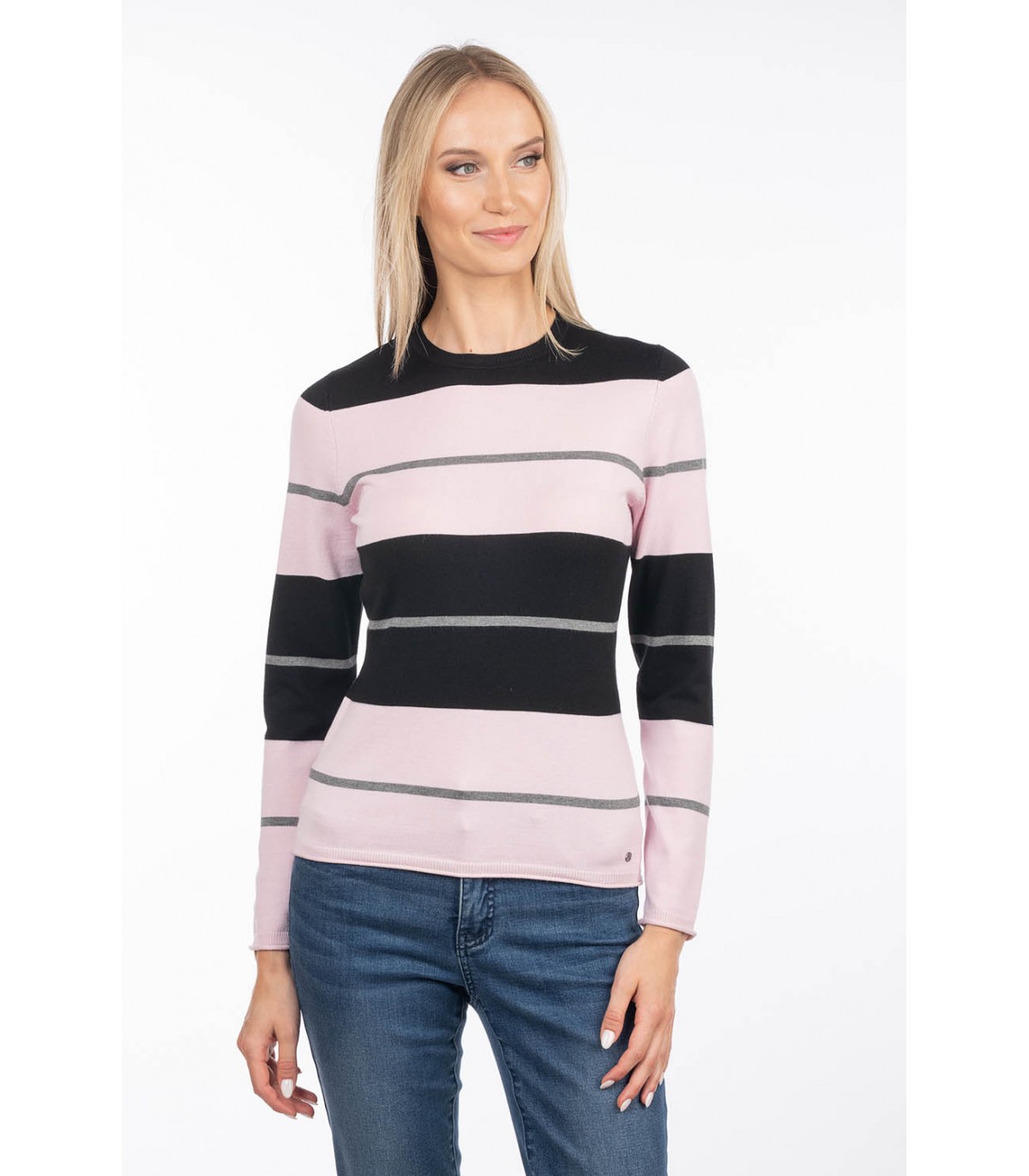 Стильный женский свитер с контрастными полосками. Идеальное дополнение к вашему гардеробу на любой сезон. Сочетание черного и нежно-розового цветов, дополненное едва заметными серыми полосками, создает женственный и современный образ. Мягкая вискозная пряжа и удобный крой делают его идеальным выбором как для офиса, так и для отдыха.