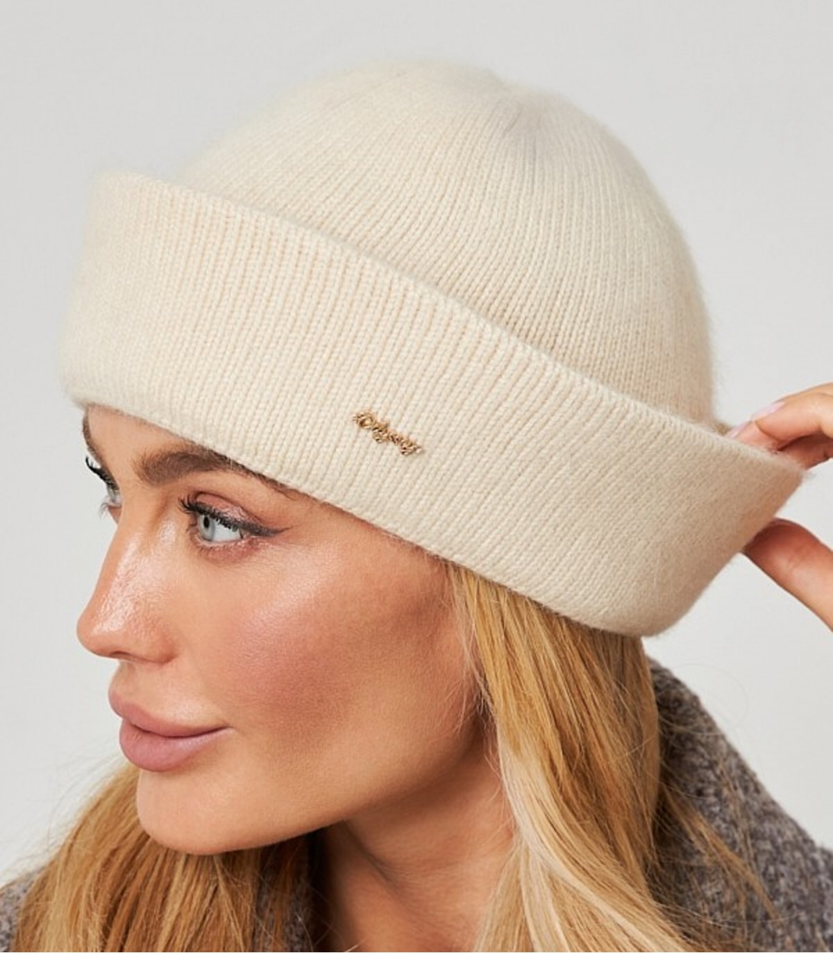 Классическая мягкая женская шляпа, тёплая и удобная в прохладные дни. У шляпы подвёрнутые поля и небольшой металлический логотип сбоку.