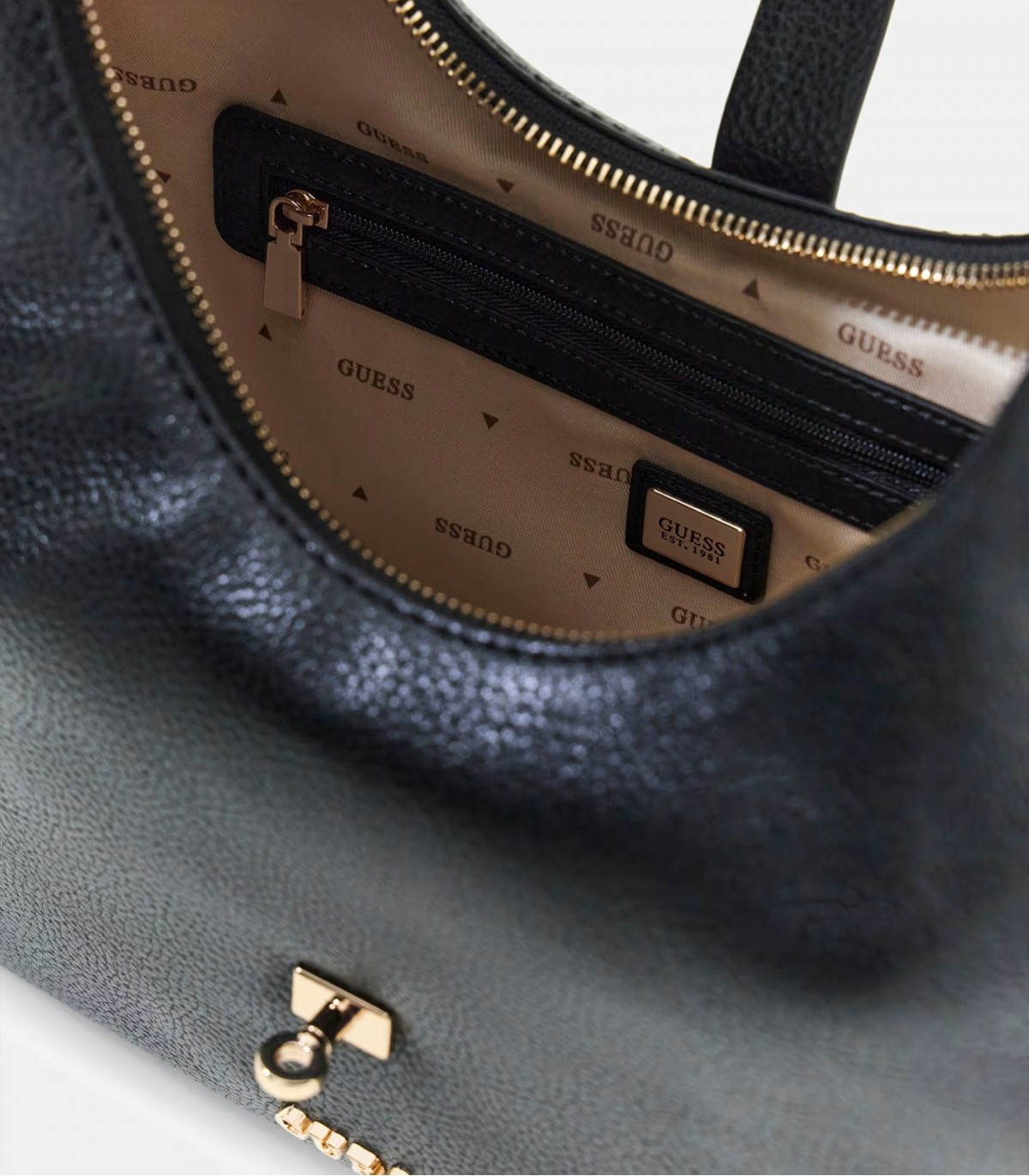 Šī Guess sieviešu soma ir izgatavota no augstas kvalitātes mākslīgās ādas un dekorēta ar zelta krāsas furnitūru, piešķirot tai stilīgu un elegantu izskatu. Metāla detaļas un noņemami logotipa piekariņi izceļ somas raksturu. Iekšpusē un aizmugurējās kabatās ir rāvējslēdzējs, kas nodrošina ērtu organizēšanu.