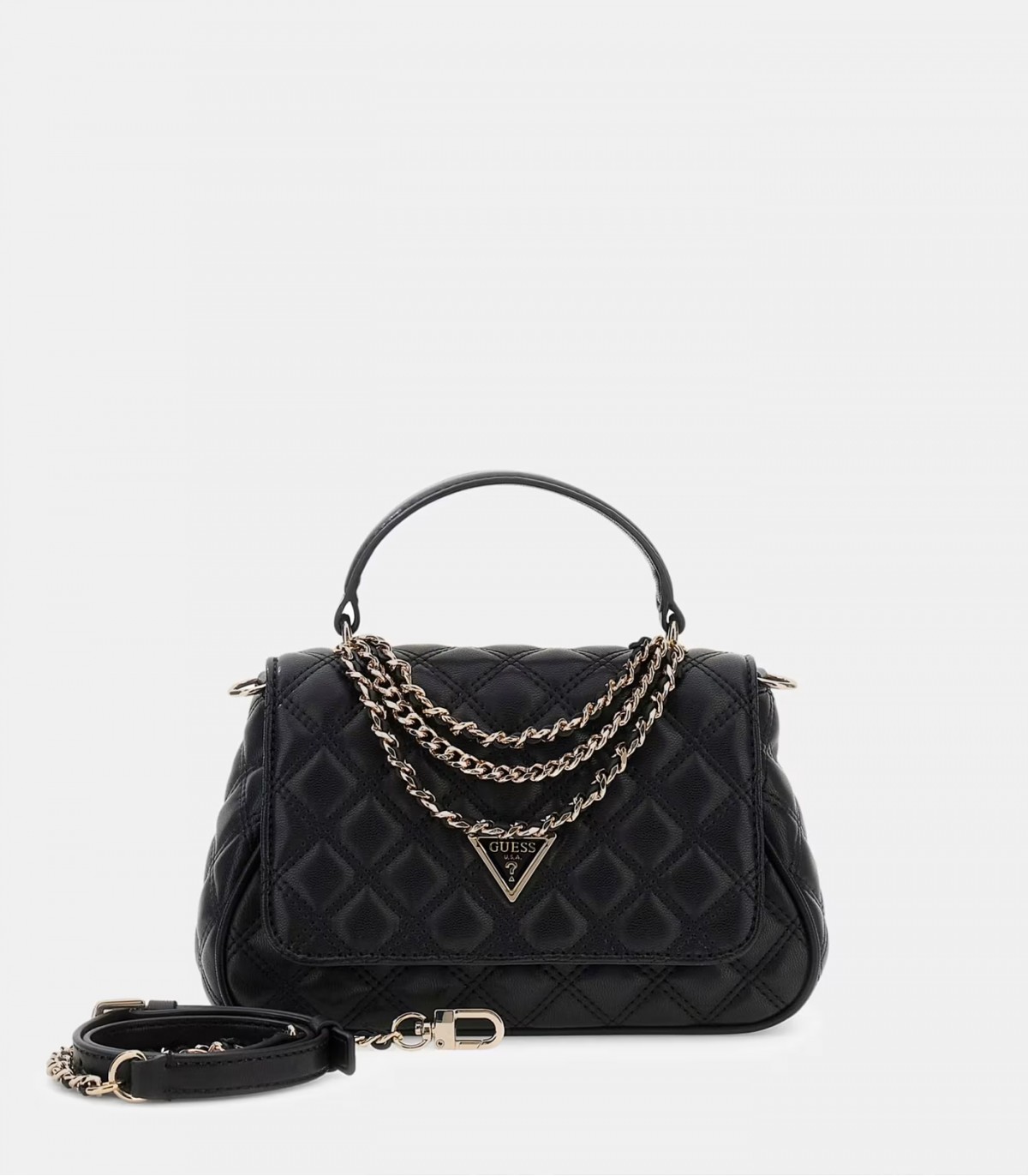 Šī stepētā Guess mākslīgās ādas soma ir dekorēta ar zelta metāla ķēdītēm un trīsstūrveida logotipu. Kompakts un elegants, šis stils ir lieliski piemērots gan ikdienas lietošanai, gan svinīgiem gadījumiem.