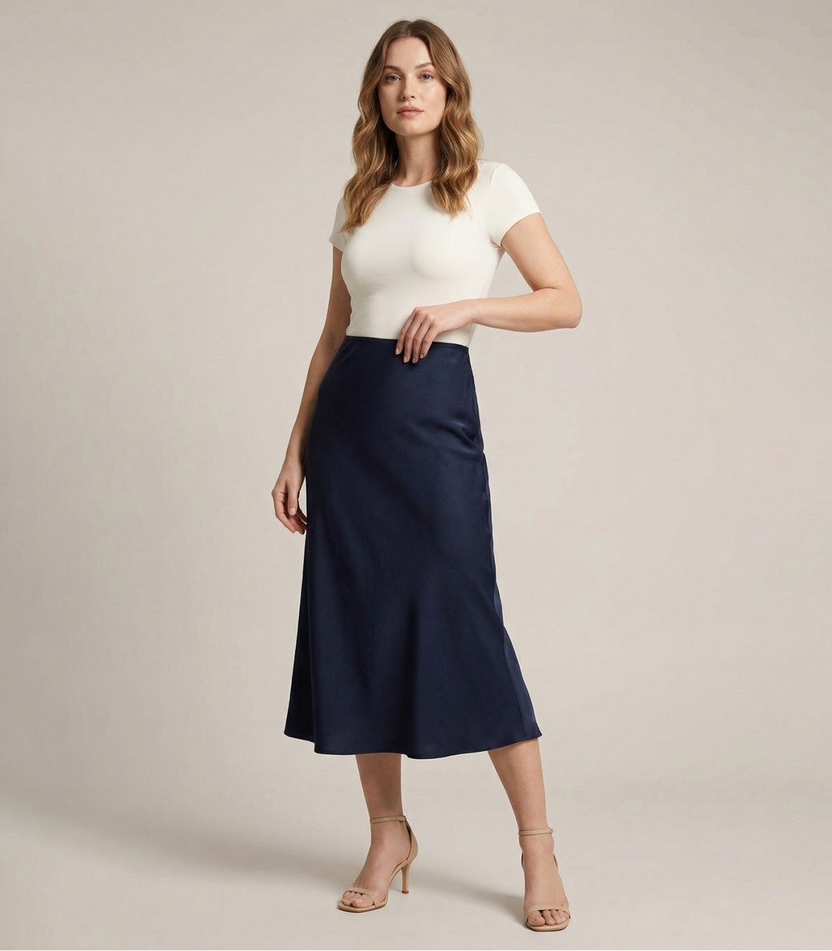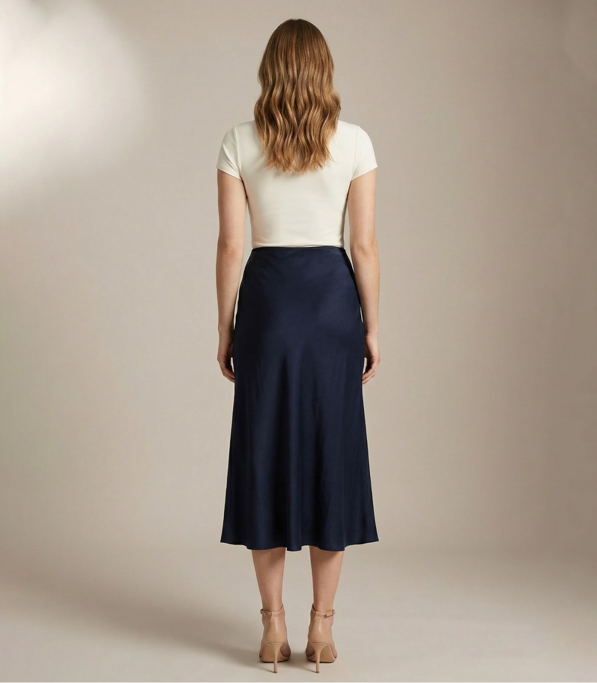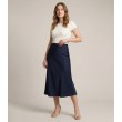 Šie sieviešu midi garuma svārki ir darināti no plūstoša viskozes satīna ar smalku, elegantu spīdumu. Elegantais siluets ar augsto jostasvietu izceļ vidukli un rada izsmalcinātu izskatu.