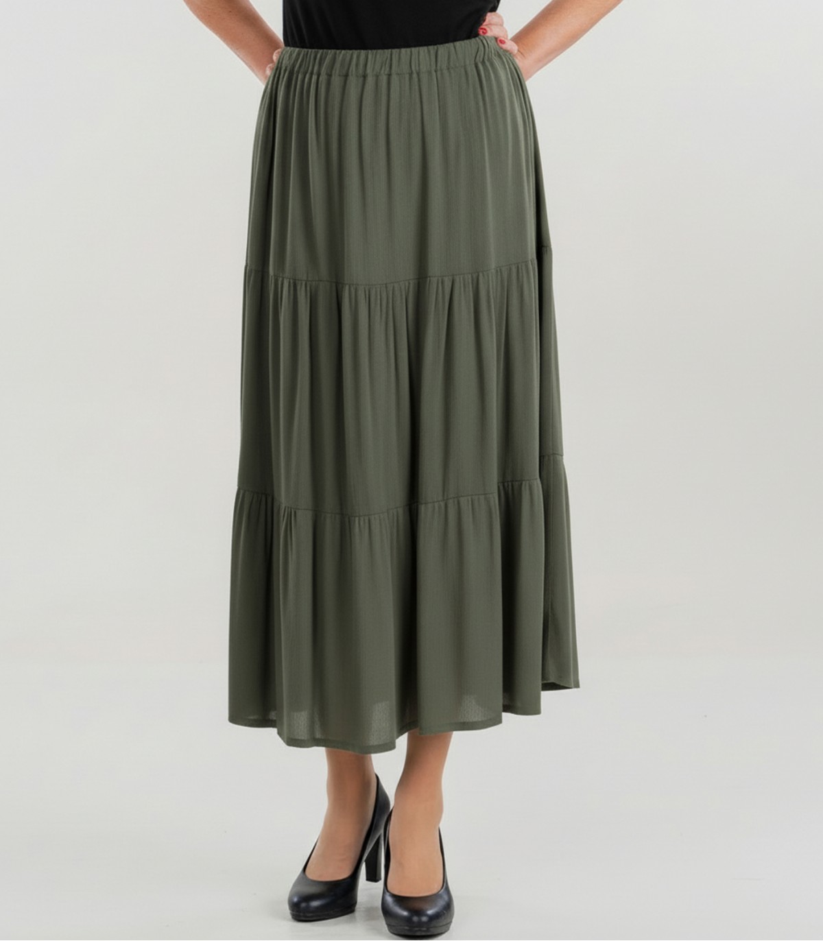 Eleganti sieviešu Hansmark svārki ikdienas valkāšanai. To elastīgā jostasvieta un daudzpakāpju piegriezums piešķir sievišķību un kustību brīvību.