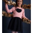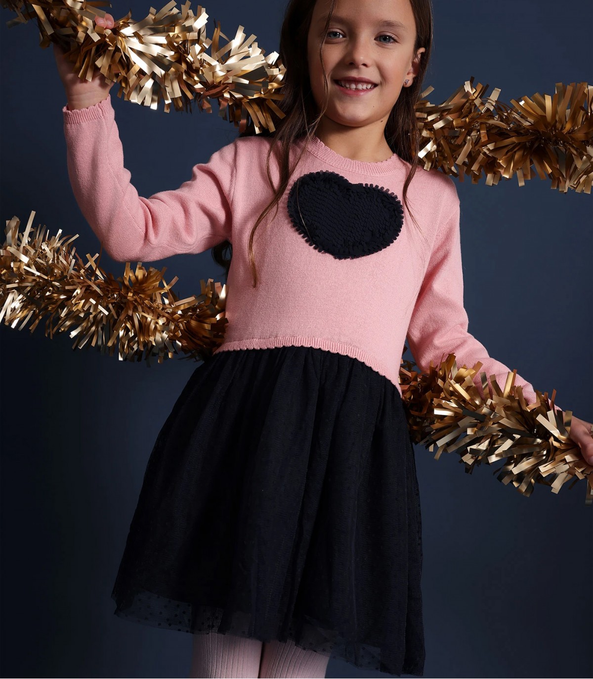 Kombinēta trikotāžas kleita meitenēm ir stilīgs un ērts risinājums ikdienas garderobei vai īpašiem gadījumiem. Augšdaļa ir izgatavota no mīksta trikotāžas džersija ar sirds formas aplikāciju. Svārki ir izgatavoti no viegla tilla ar punktiņu apdruku, kas piešķir tēlam maigumu un rotaļīgumu. Kleita labi sader ar zeķubiksēm un baleta kurpēm, radot pilnīgu tēlu pastaigām vai svētkiem.