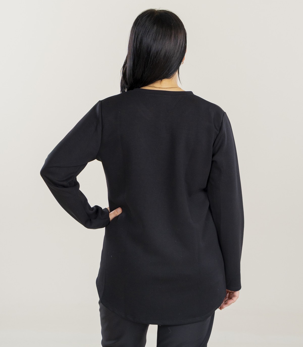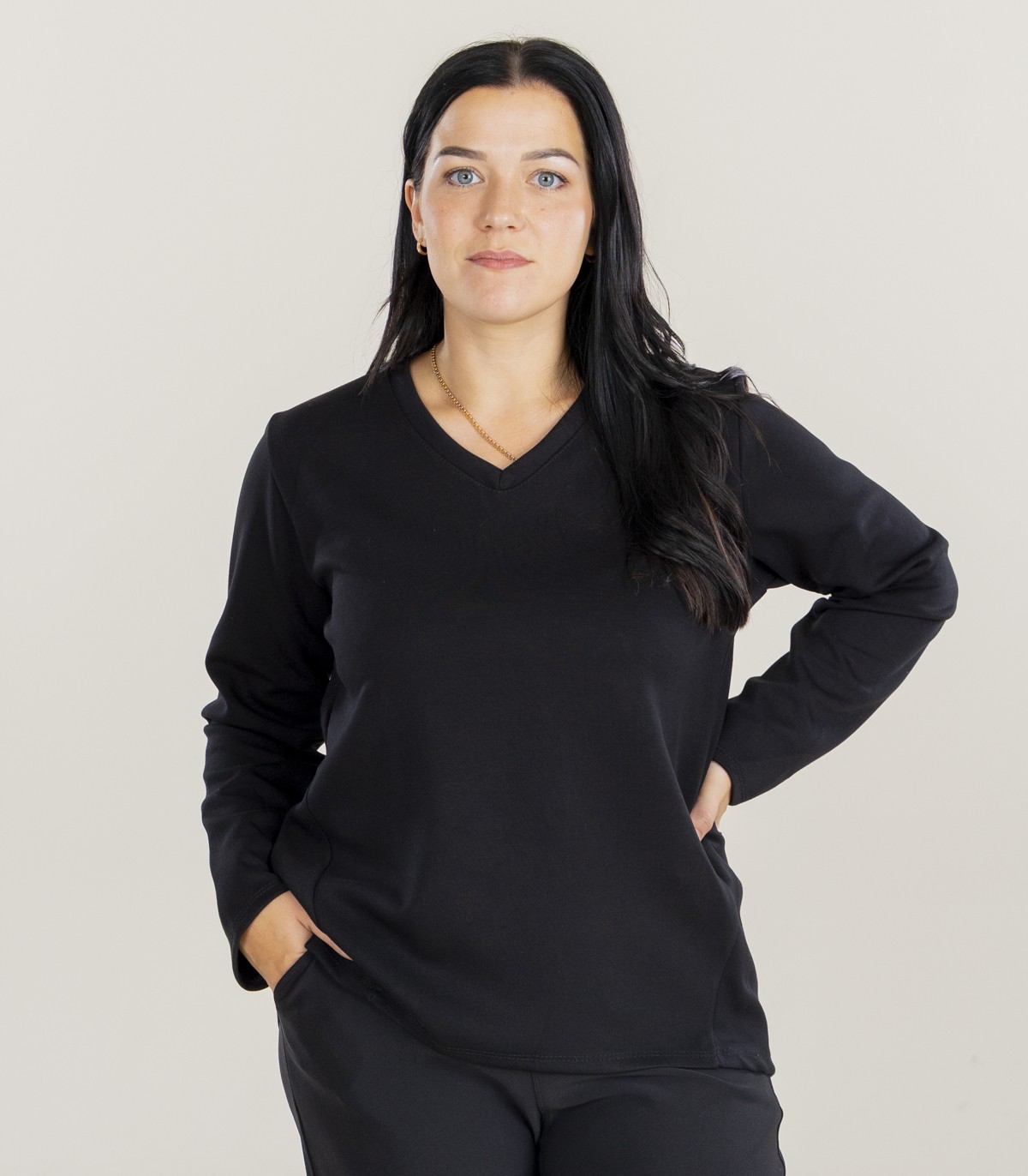 Viegls un ērts sieviešu krekls ikdienai. Melnais modelis ar V veida kakla izgriezumu un taisnu piegriezumu labi sader ar dažādiem tērpiem.
