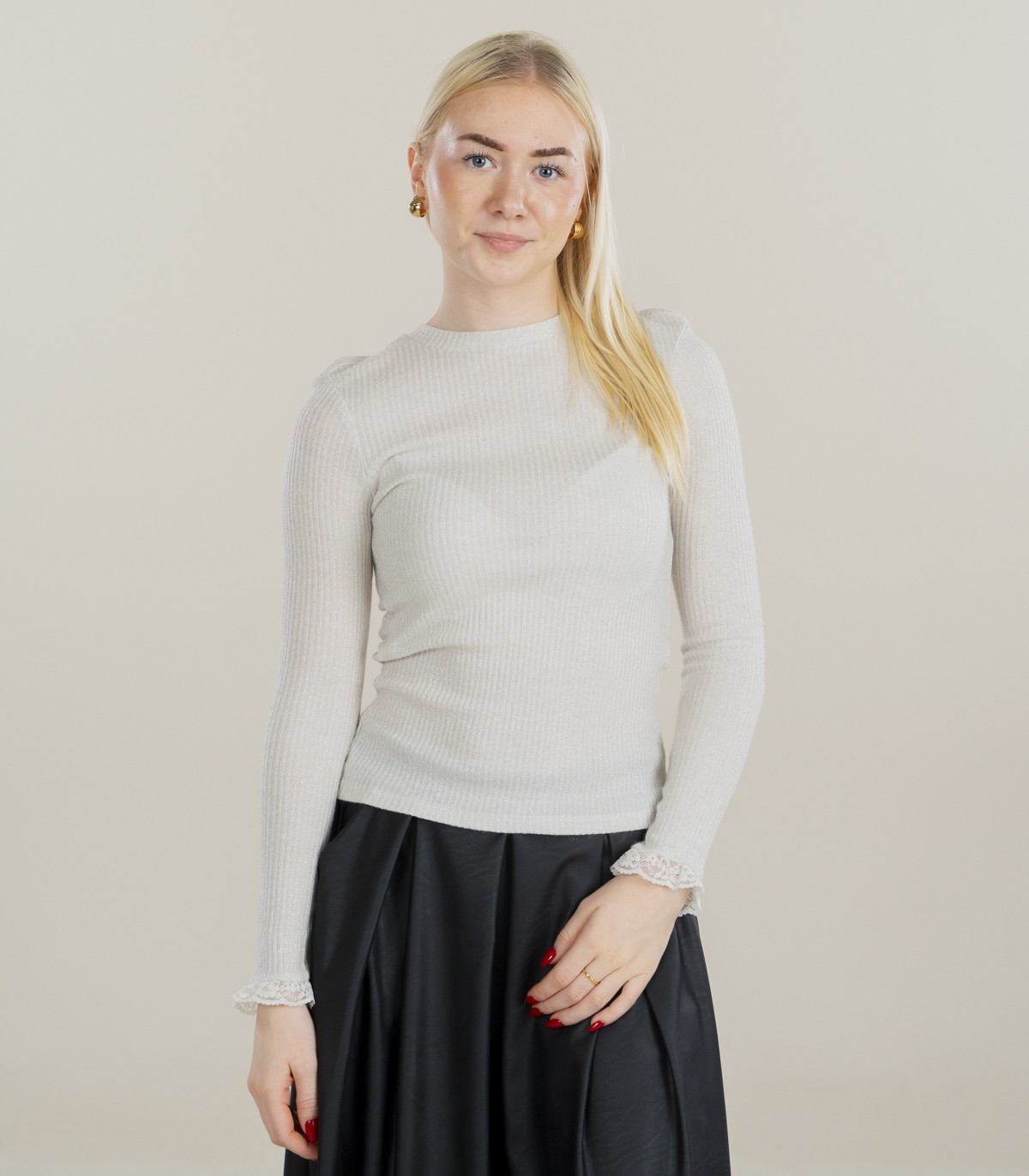 Viegls, mīksts sieviešu rievots krekls ar klasisku apaļu kakla izgriezumu. Piedurknes ir apdarinātas ar smalkām, sievišķīgām mežģīnēm. Lieliski piemērots valkāšanai atsevišķi vai kopā ar jakām un džemperiem.