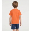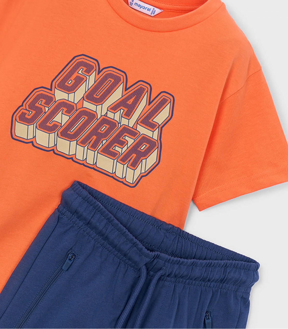 Šis ērtais un sportiskais zēnu komplekts sastāv no oranža T-krekla un tumši ziliem šortiem. T-kreklam ir apdruka "GOAL SCORER", kas piešķir enerģijas un rotaļīguma pieskārienu. Mīkstais kokvilnas materiāls ir elpojošs un ērts.