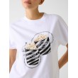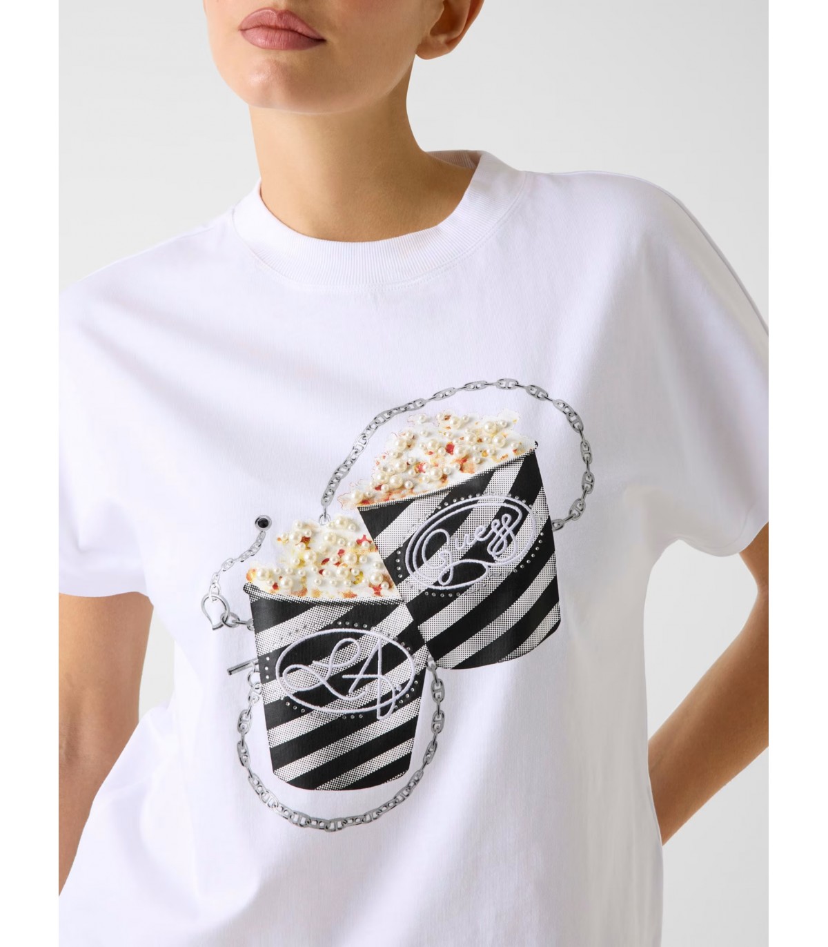 Šim sieviešu T-kreklam priekšpusē ir popkorna grafika, kas dekorēta ar mākslīgajiem dimantiem un pērlēm. Īsroku, brīvā krīta modelis ir lieliski piemērots ikdienas valkāšanai un viegli sader ar dažādiem tērpiem.