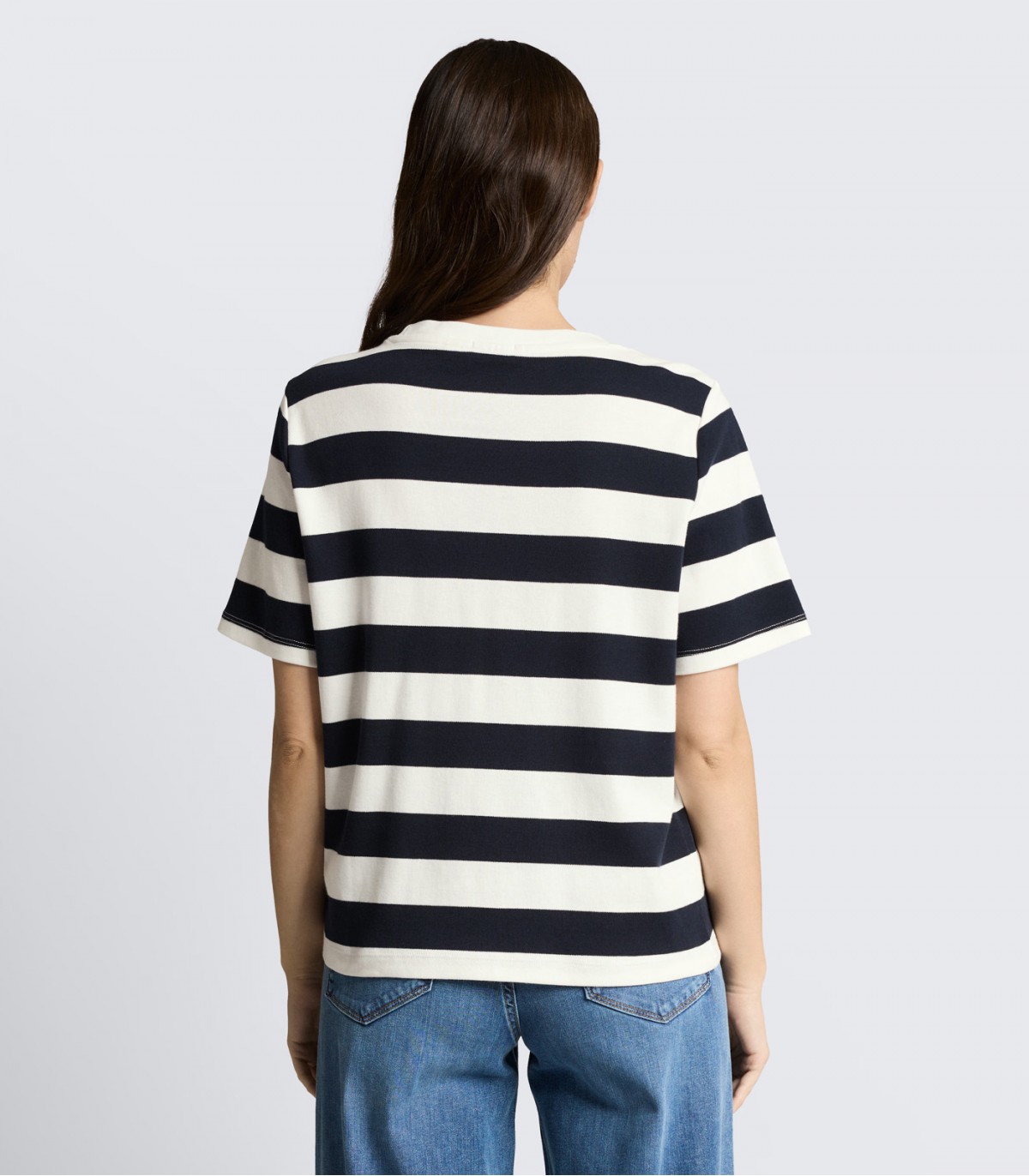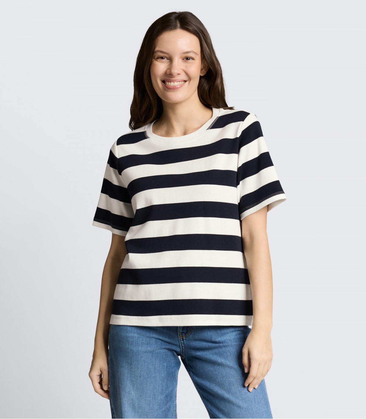 Šis sieviešu T-krekls ir izgatavots no necaurspīdīga kokvilnas džersija un tam ir brīva piegriezne. Tas ir ērts ikdienas valkāšanai un viegli sader ar džinsiem, biksēm vai svārkiem.