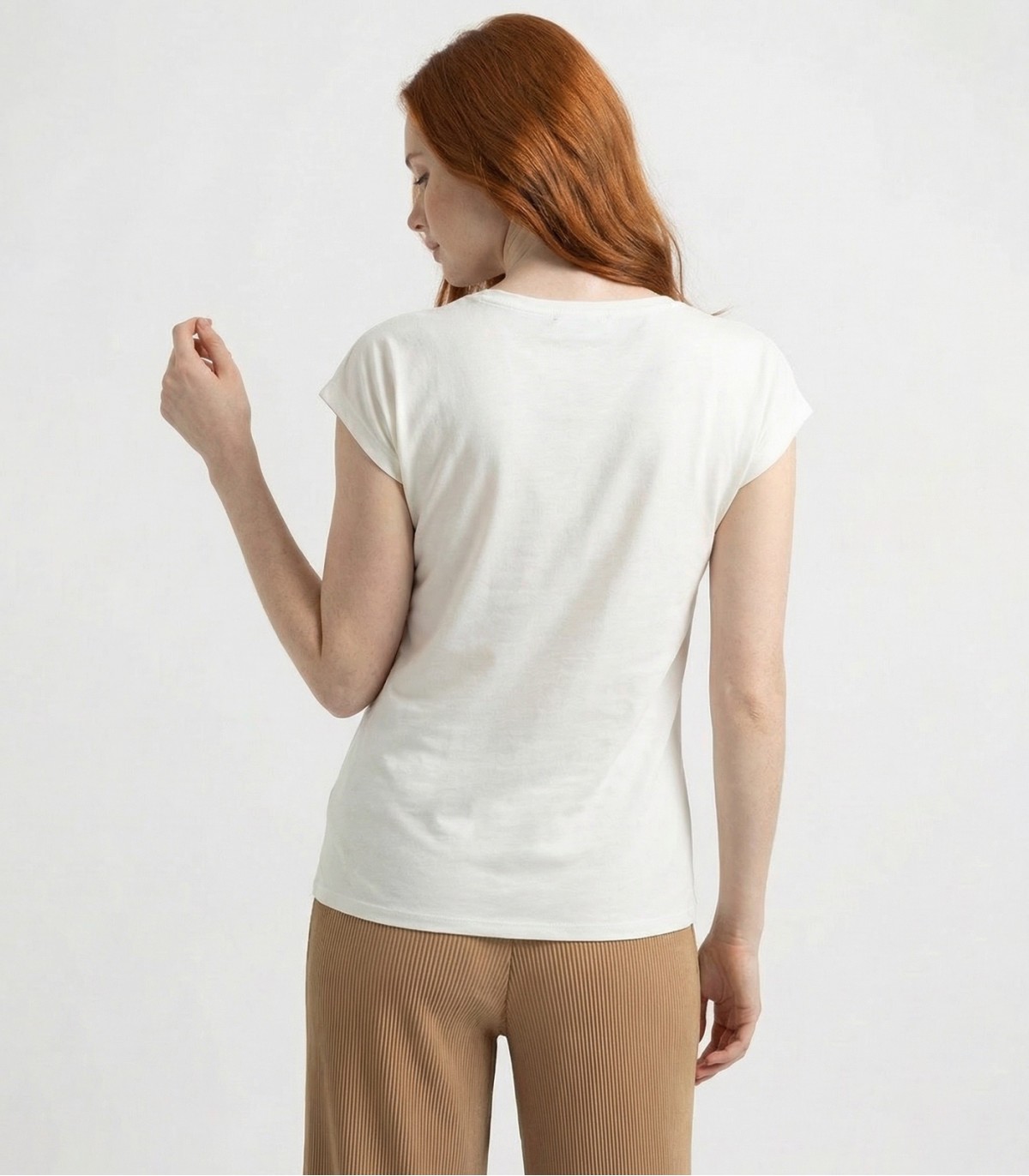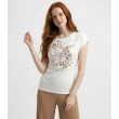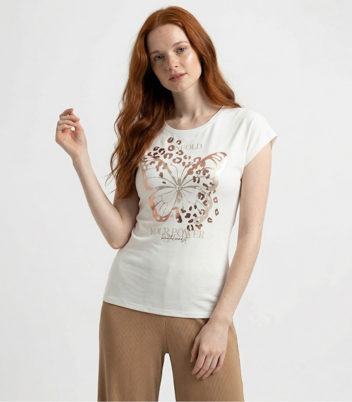 Šis sieviešu T-krekls ir izgatavots no mīksta jaukta auduma, lai nodrošinātu komfortu un ērtu valkāšanu. Ar īsām, nokarenām piedurknēm un brīvu piegriezumu tas rada ikdienišķu, bet stilīgu izskatu. Eleganta zelta apdruka uz krūtīm piešķir izsmalcinātību.