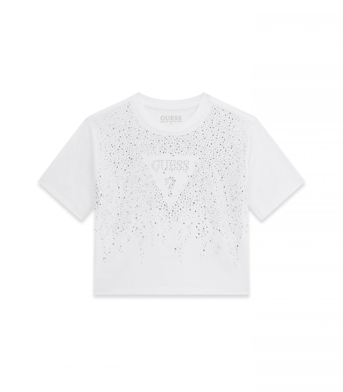 Balts īsroku T-krekls, kas rotāts ar mirdzošiem akmeņiem un Guess logotipu priekšpusē. Tā ērtā piegriezne ir lieliski piemērota gan ikdienas valkāšanai, gan svinīgākiem gadījumiem.