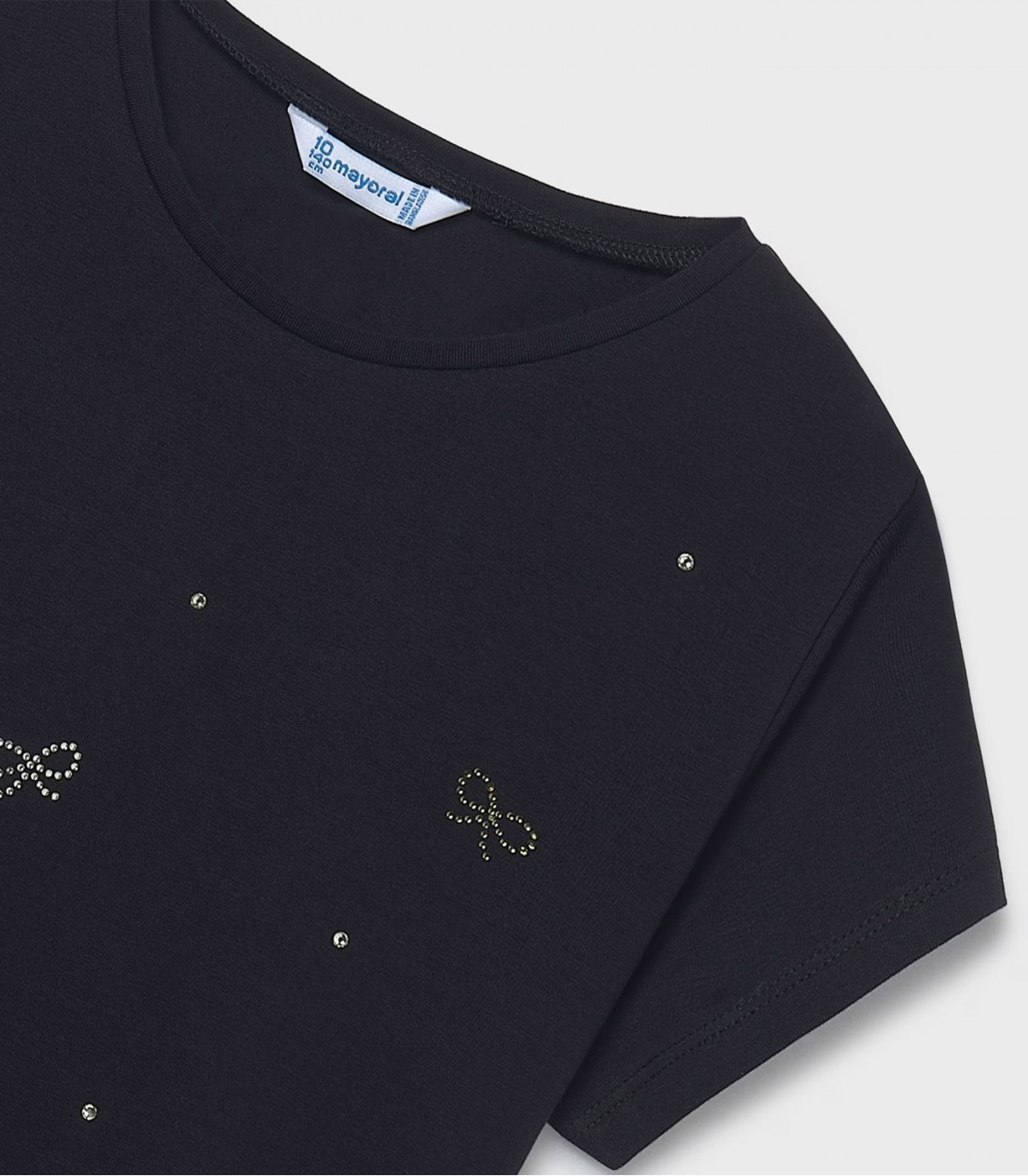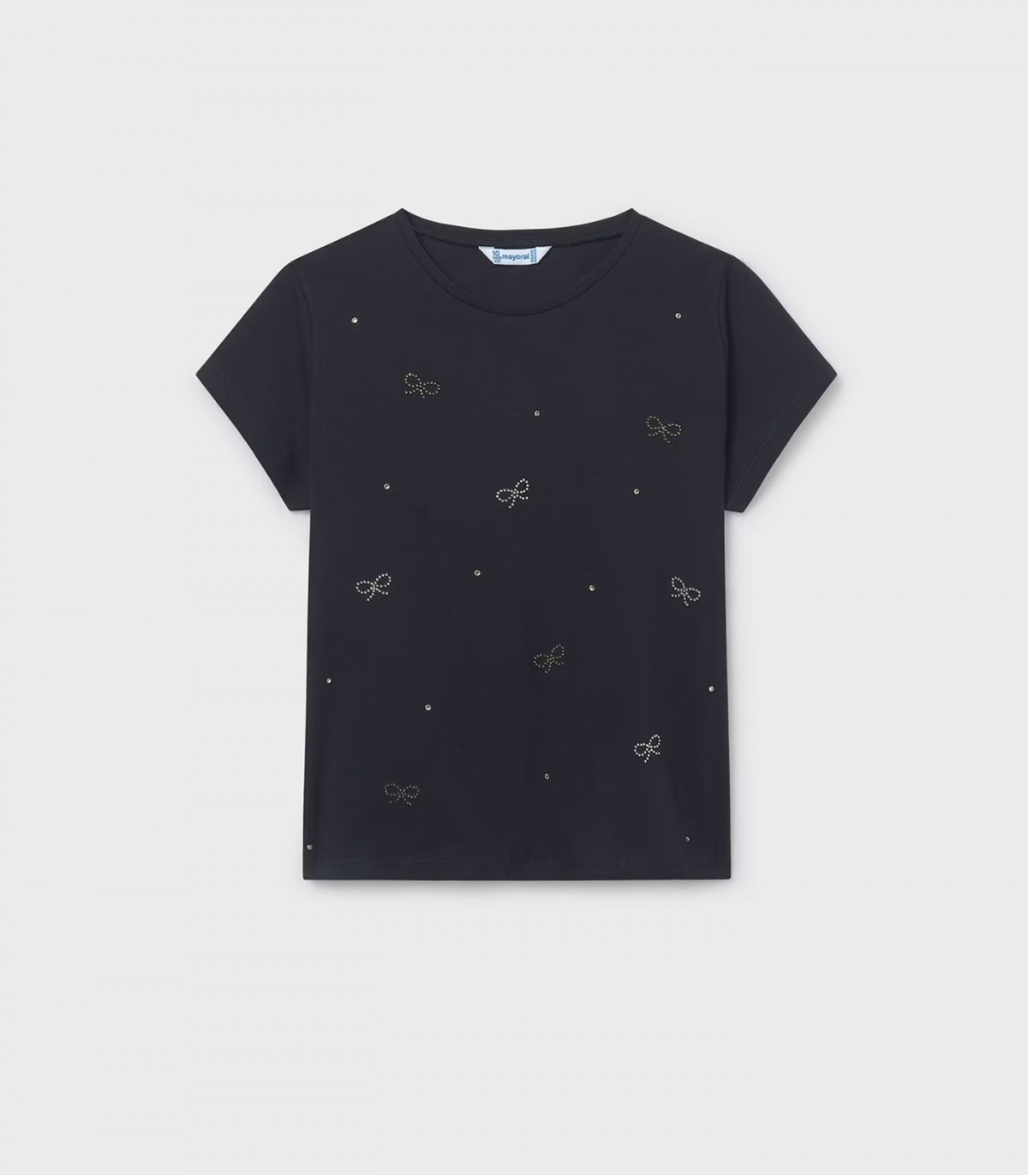 Šim meiteņu T-kreklam priekšpusē ir mazas mākslīgo akmentiņu bantītes. Tam ir ērts, taisns piegriezums un īsas piedurknes, kas padara to ideāli piemērotu ikdienas valkāšanai. Mīkstais audums ir patīkams pieskārienam un elpojošs.