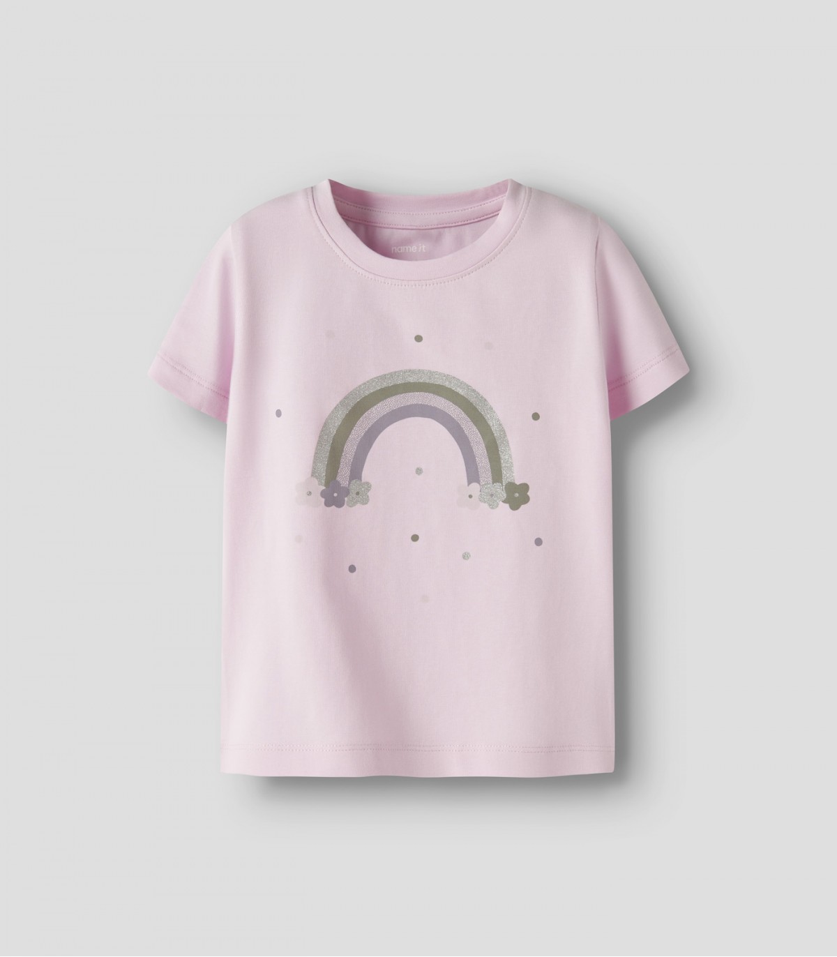 Šis meiteņu T-krekls no Name IT ir izgatavots no mīkstas kokvilnas. Tam ir košs apdruka priekšpusē ar mirdzošām detaļām rotaļīgam un elegantam izskatam. Tā klasiskais, taisnais piegriezums ar īsām piedurknēm un apaļu kakla izgriezumu padara to ērtu ikdienas valkāšanai.