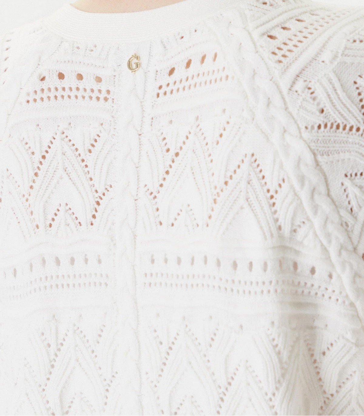 Guess sieviešu mežģīņu pogu kardigans. Tas apvieno modernu dizainu un komfortu, padarot to par daudzpusīgu izvēli dažādiem tēliem.