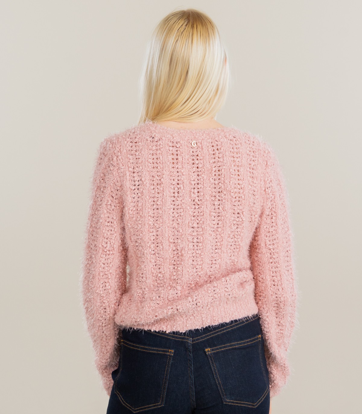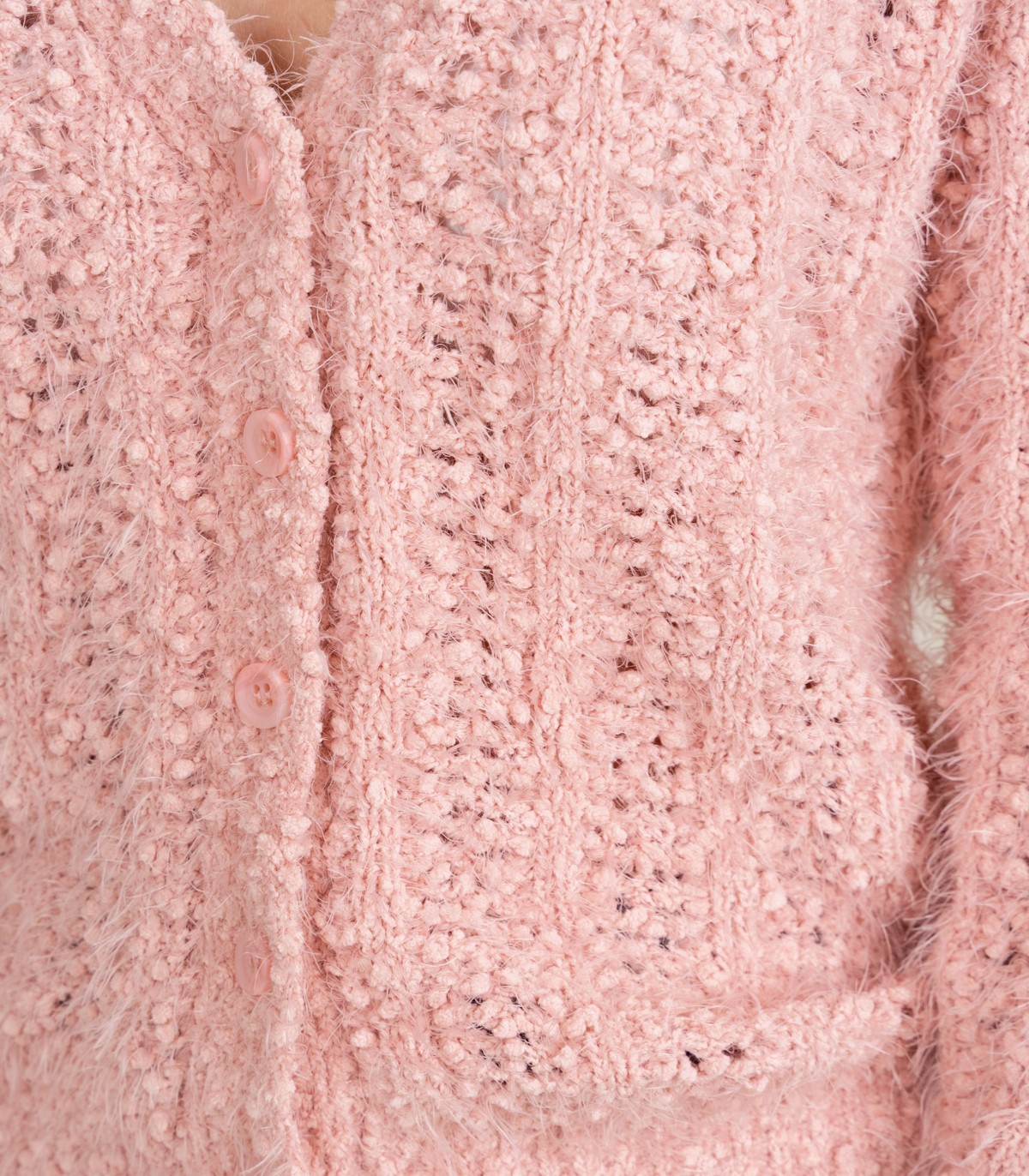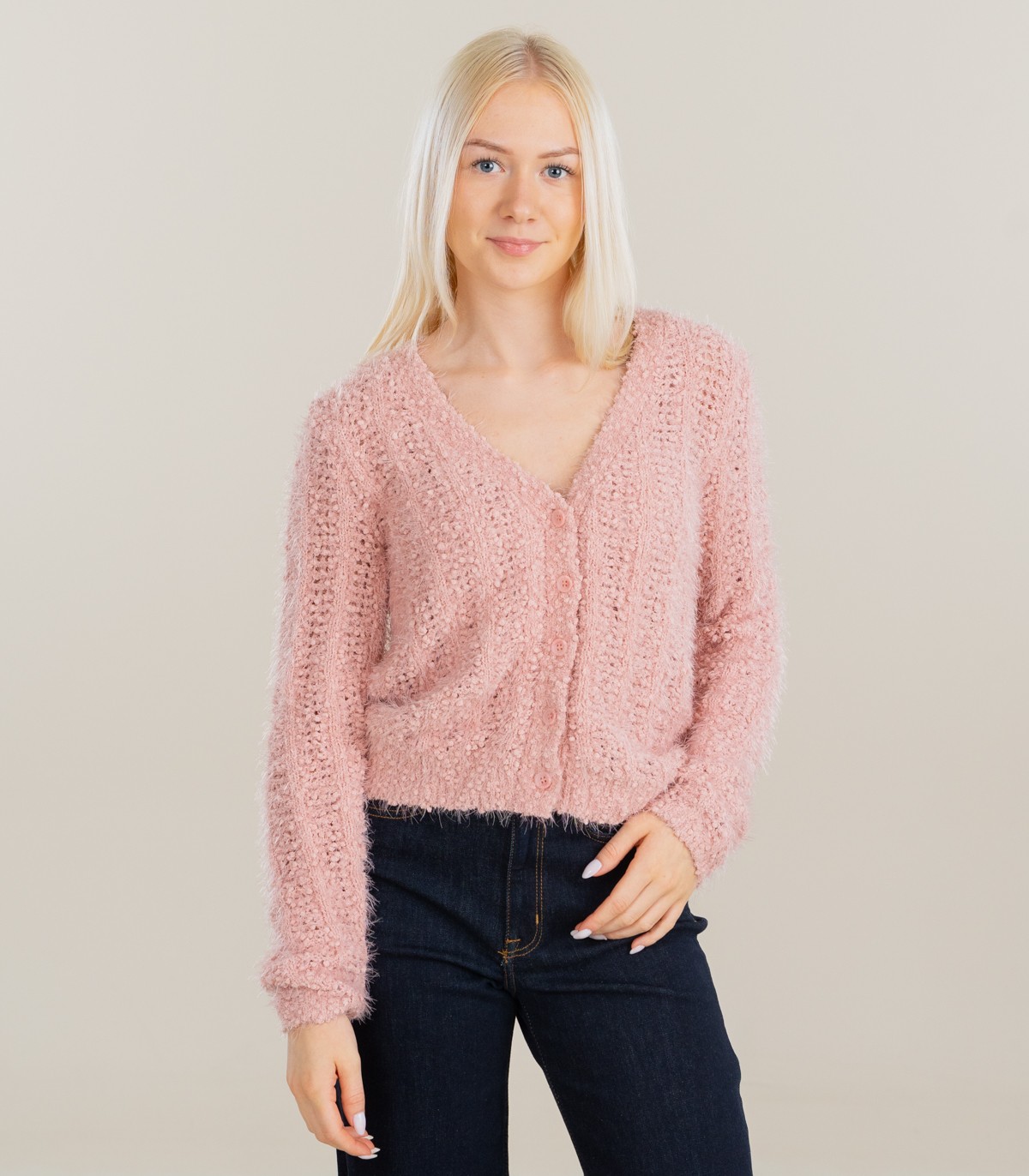 Vieglais un teksturētais Guess sieviešu kardigans ir ar klasisku V veida kakla izgriezumu un pogu aizdari, radot klasisku siluetu, kas viegli sader gan ar biksēm, gan svārkiem.