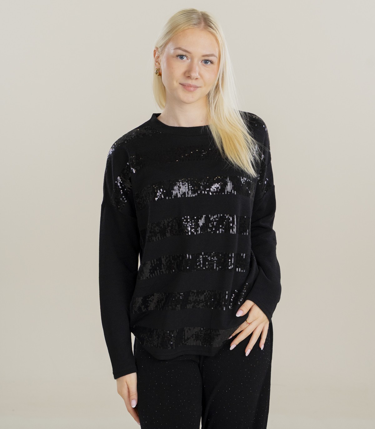 Taisna piegriezuma Hailys sieviešu džemperis apvieno komfortu un stilu. Priekšpusē ir platas, mirdzošu fliteru svītras, radot izteiksmīgu un svētku akcentu.