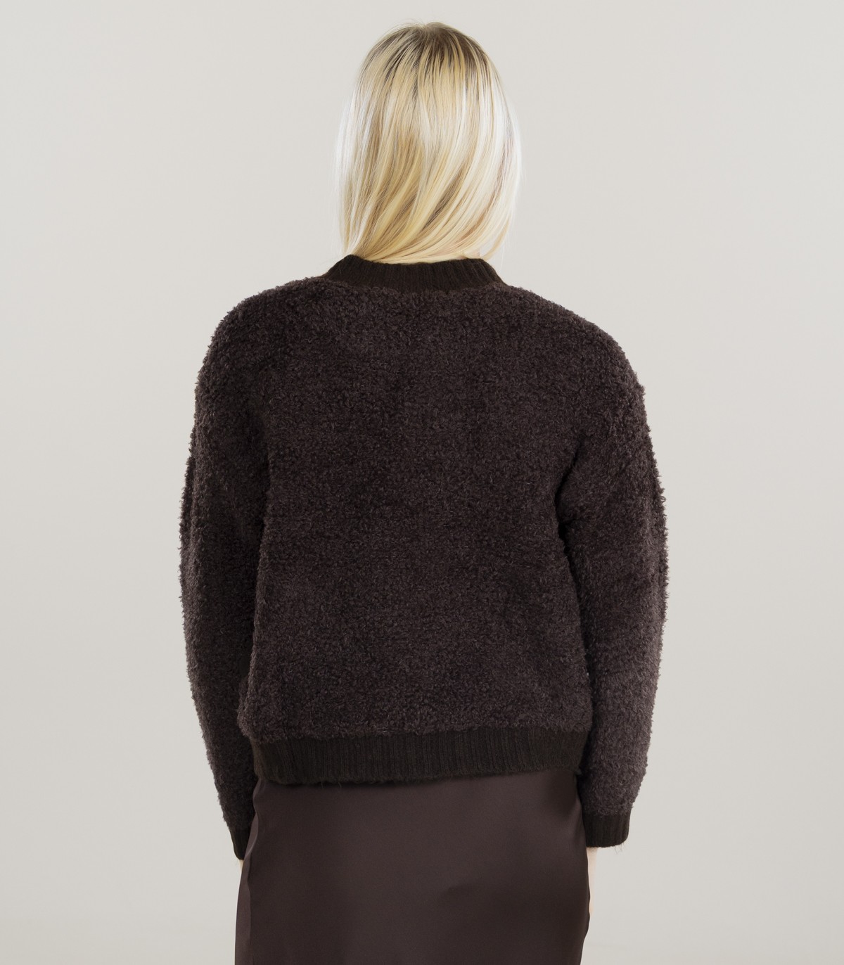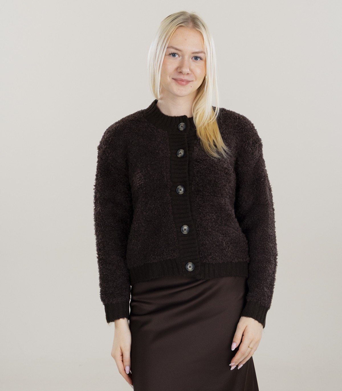 Hailys sieviešu īsais buklē kardigans ar pogu aizdari priekšpusē apvieno komfortu un stilu. Apaļa, rievota apkakle un rievota apdare gar pogu aizdari rada glītu un elegantu izskatu.