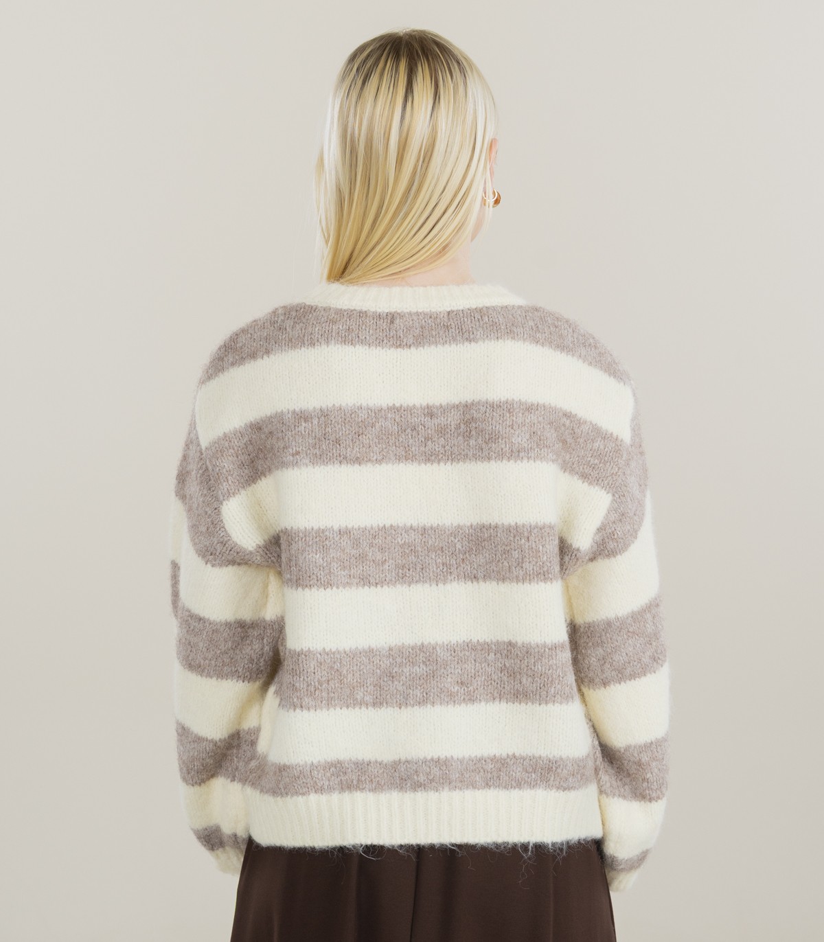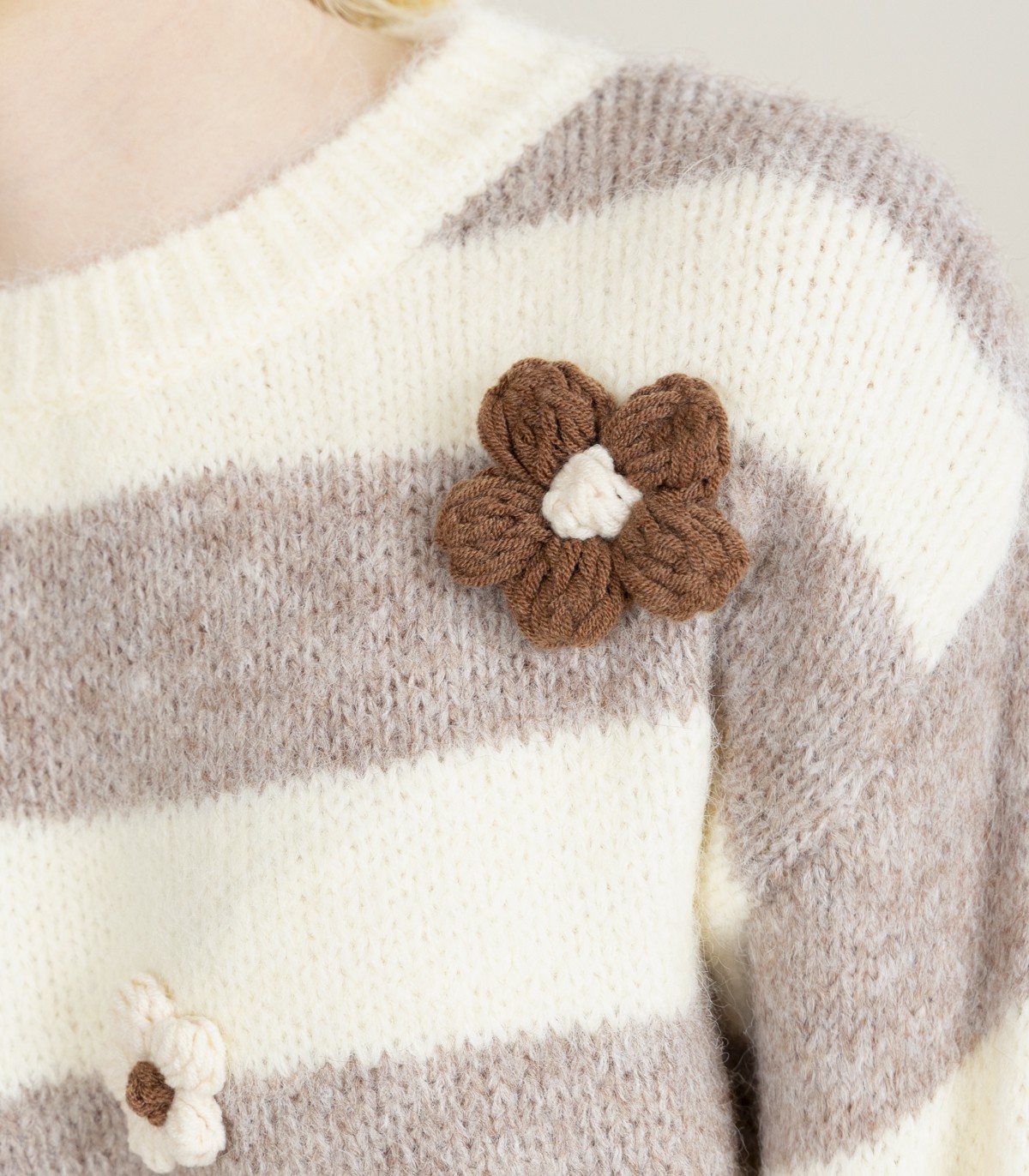 Mīksts un silts svītrains džemperis ar mīlīgiem 3D ziediņiem priekšpusē. Tam ir ērts piegriezums un mājīga, pūkaina tekstūra, kas ir ideāli piemērota vēsākām dienām.