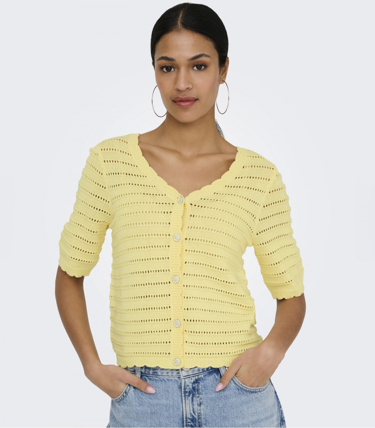 Šis sieviešu kardigans ir viegls un daudzpusīgs apģērba gabals, kas ir ideāli piemērots pavasara/vasaras sezonai. Izgatavots no mīksta trikotāžas auduma, tas ir ērts pret ķermeni un papildina gan ikdienas, gan sievišķīgāku izskatu. V veida kakla izgriezums vizuāli pagarina siluetu, savukārt īsās piedurknes piešķir apģērbam vieglu, modernu izskatu.