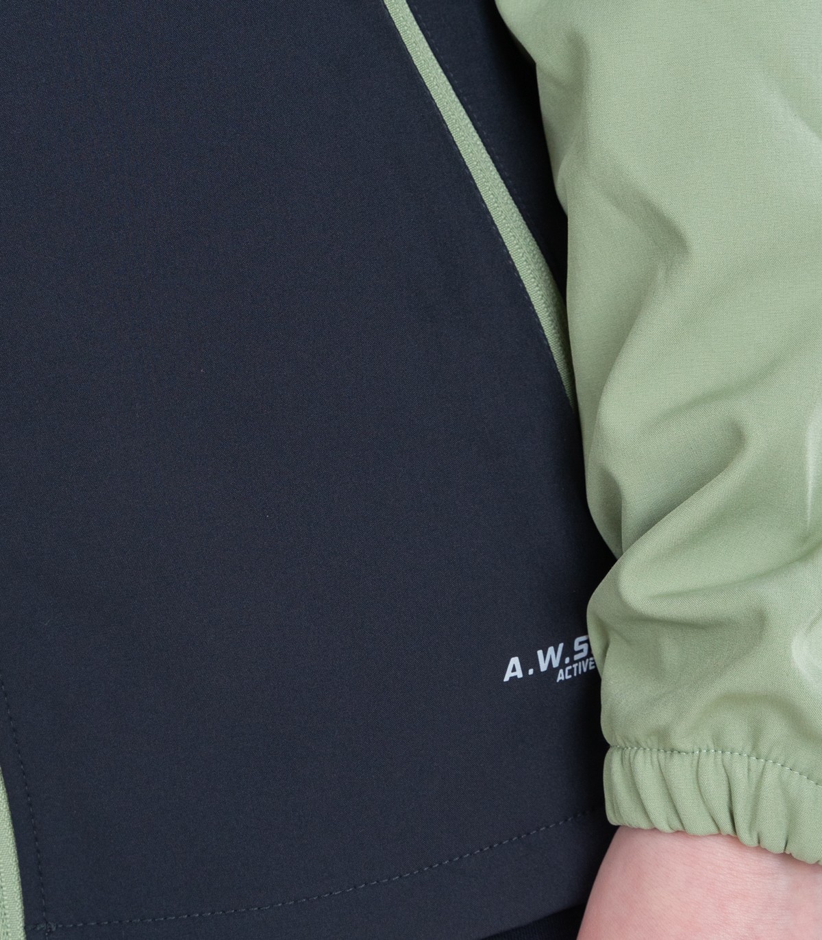 Ūdensnecaurlaidīgs un nedaudz elastīgs softshell audums (vīles nav līmētas, tāpēc jaka nav pilnībā ūdensnecaurlaidīga).
