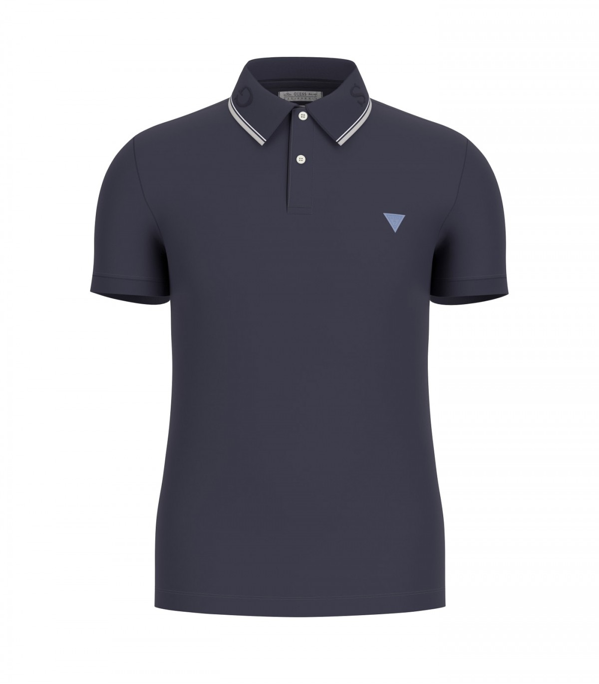 Vīriešu polo krekls ar Guess trīsstūra logotipu uz krūtīm. Kontrastējošas svītras akcentē apkakles malas, un Guess uzraksts ir izšūts apkakles iekšpusē.