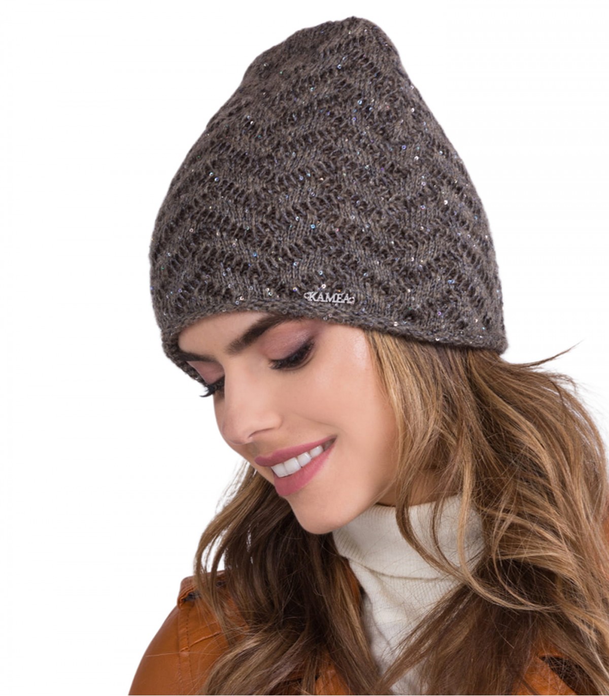 Sieviešu vienkāršā cepure ir dekorēta ar skaistu skujiņas rakstu.
