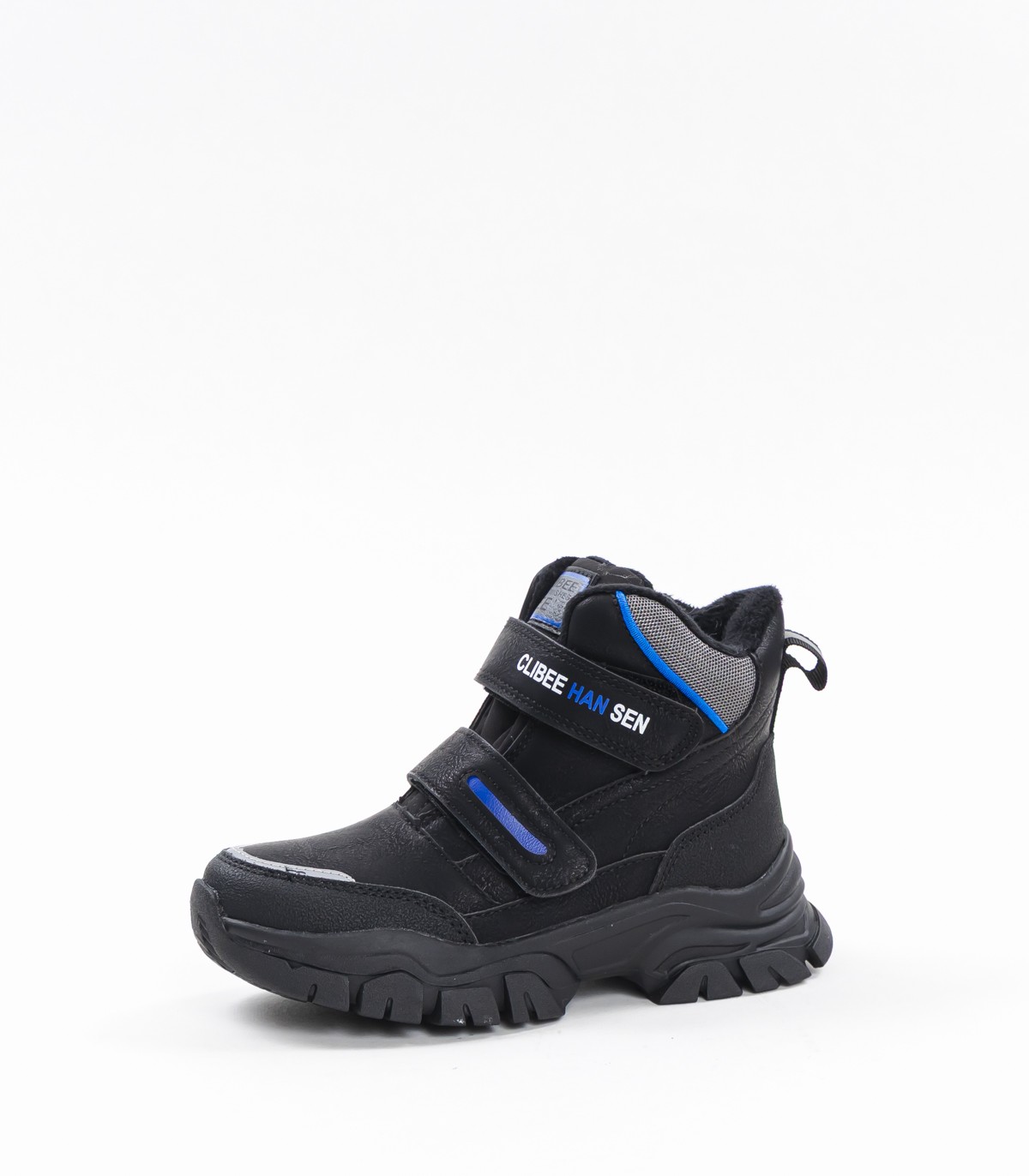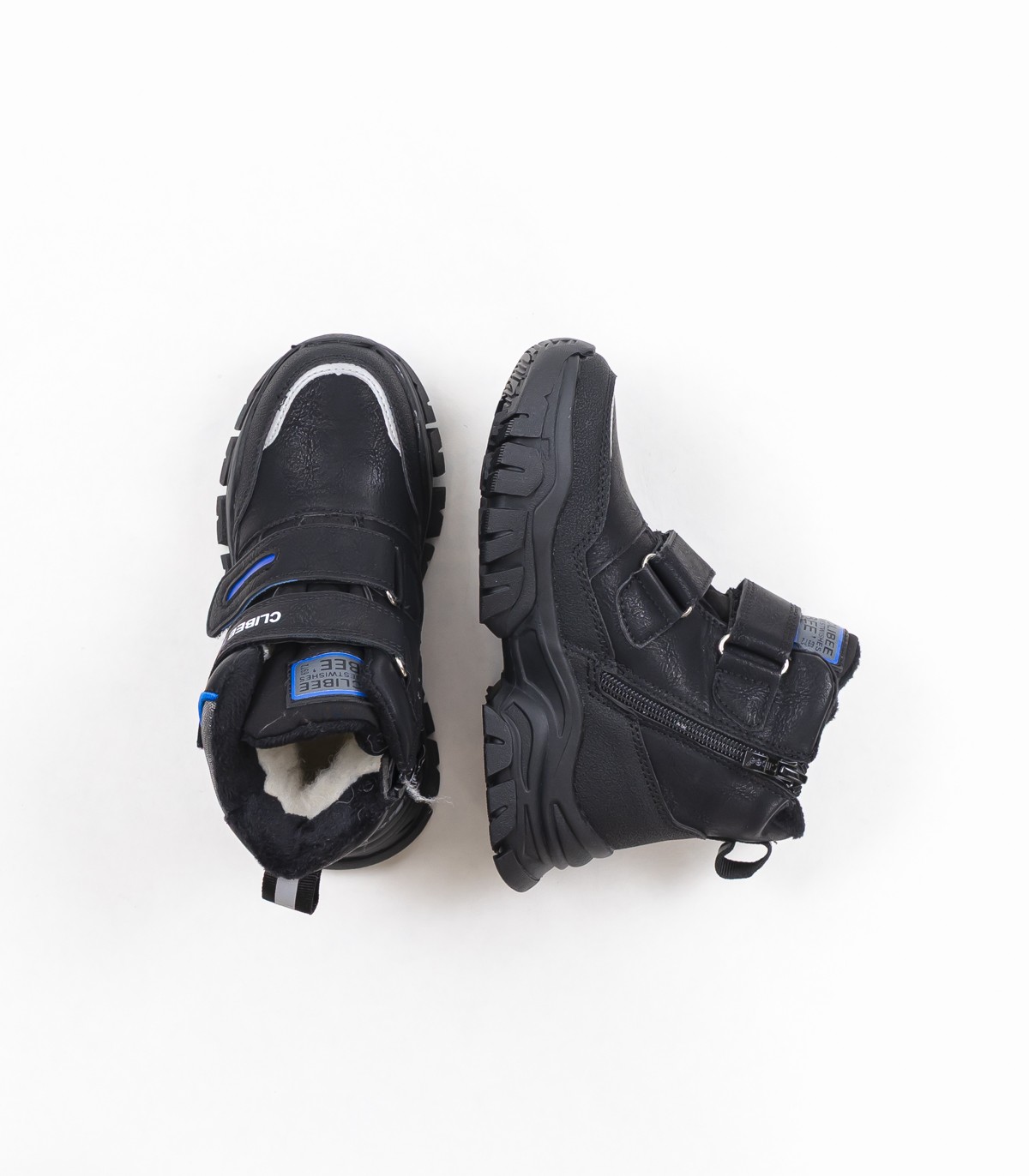 Tumši ziemas zābaki zēniem ar zilām detaļām.