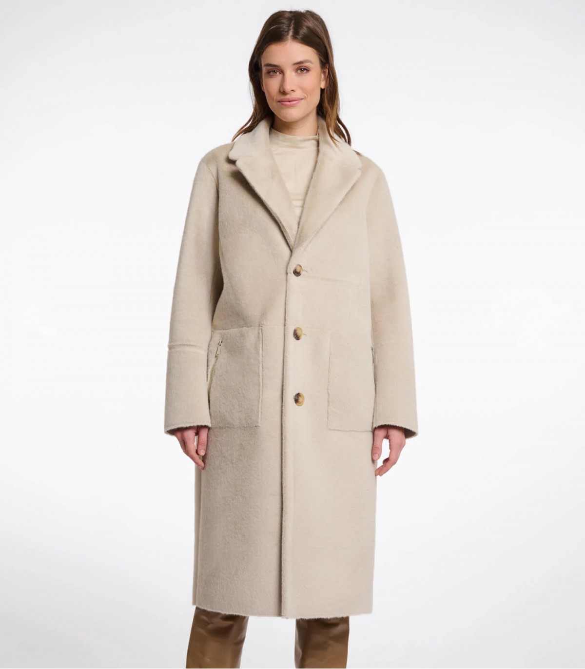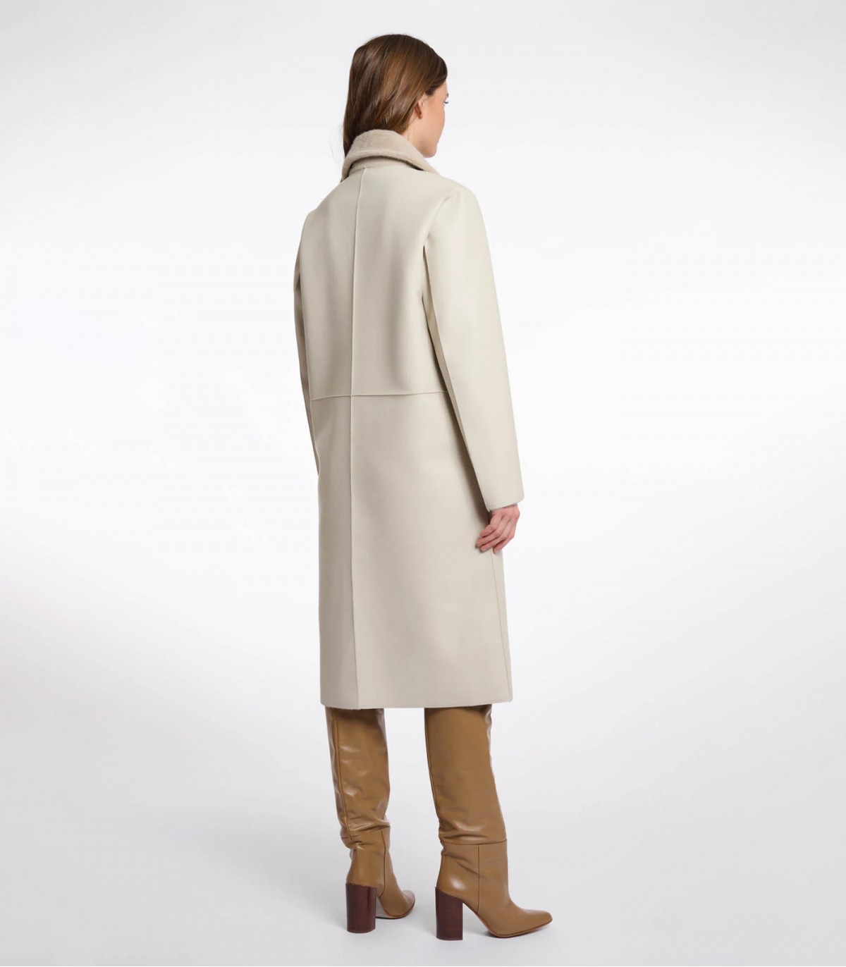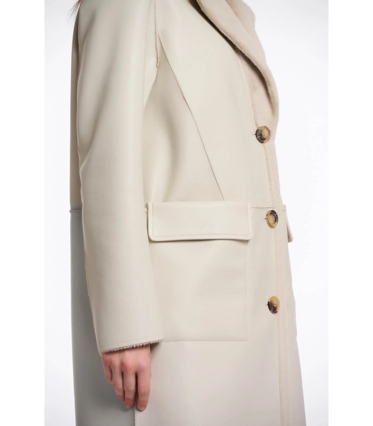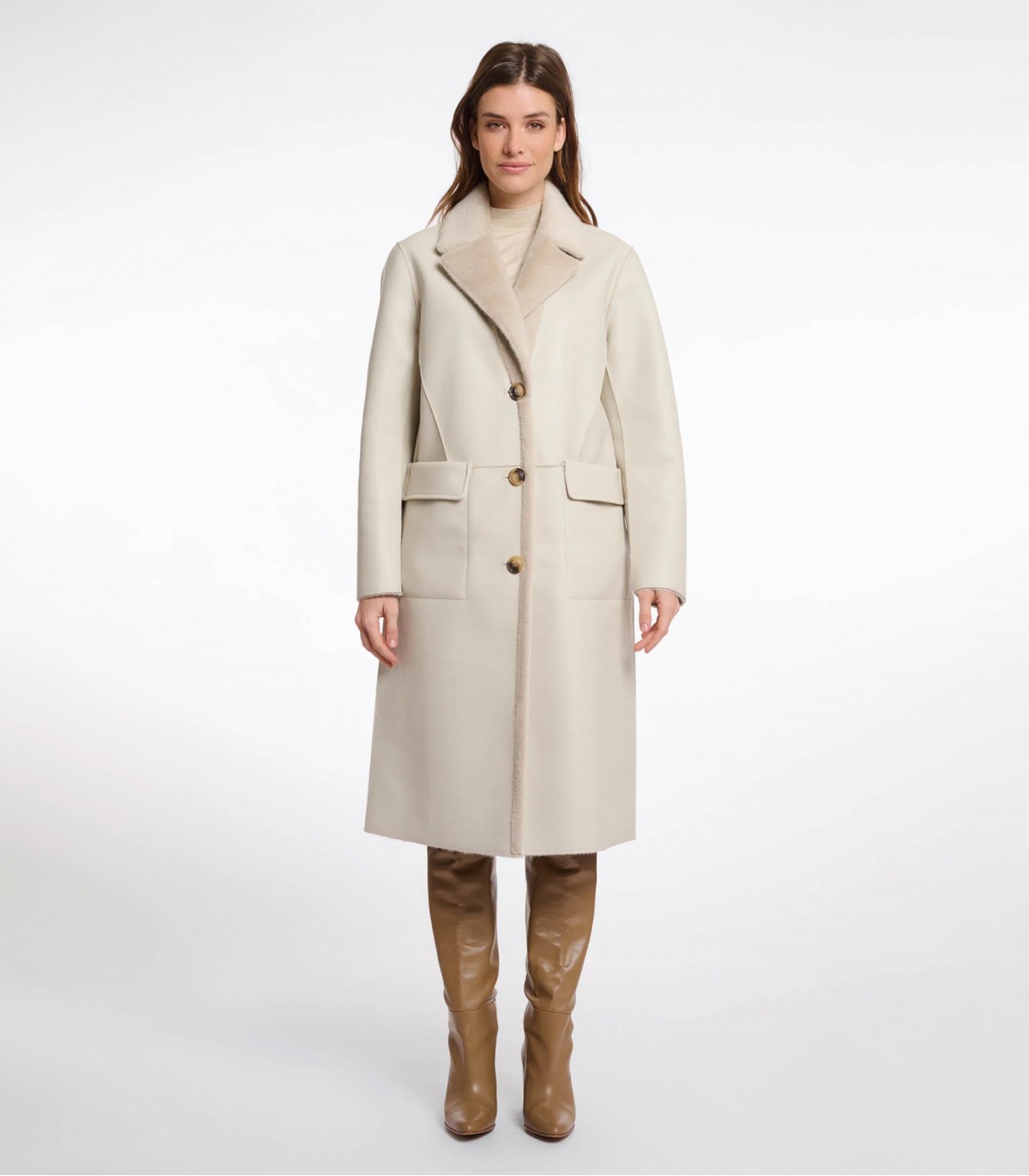 Divpusējs sieviešu mētelis ar sievišķīgu dizainu. Šo vidēja garuma mēteli var valkāt divos veidos. Tam ir pogu aizdare un ielocīta apkakle. Viena puse ir izgatavota no mākslīgās ādas un tai ir divas ieloces kabatas ar atlokiem sānos. Otra puse ir izgatavota no greznas mākslīgās kažokādas un tai ir divas priekšējās kabatas ar rāvējslēdzējiem.