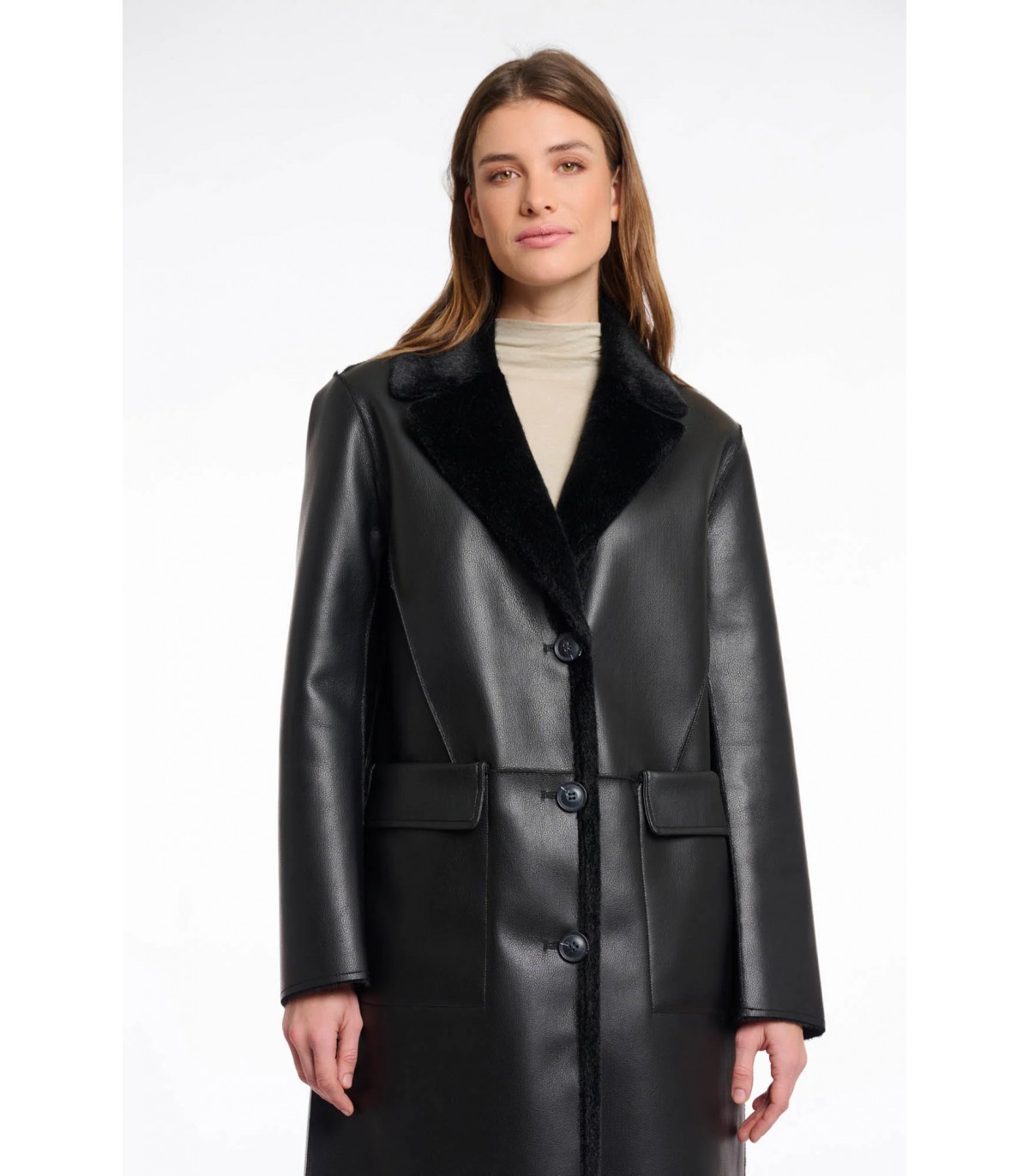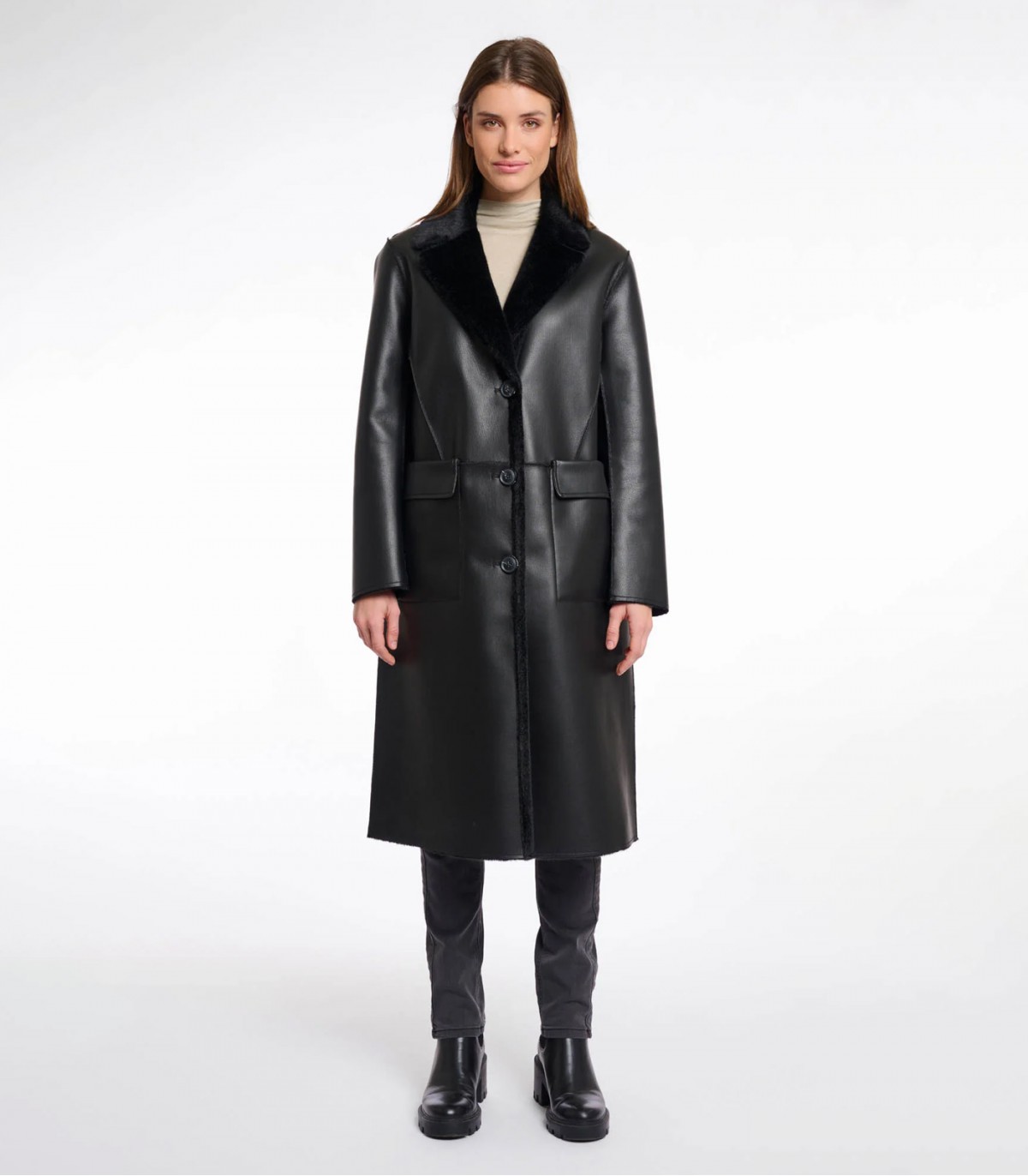 Divpusējs sieviešu mētelis ar sievišķīgu dizainu. Šo vidēja garuma mēteli var valkāt divos veidos. Tam ir pogu aizdare un ielocīta apkakle. Viena puse ir izgatavota no mākslīgās ādas un tai ir divas ieloces kabatas ar atlokiem sānos. Otra puse ir izgatavota no greznas mākslīgās kažokādas un tai ir divas priekšējās kabatas ar rāvējslēdzējiem.